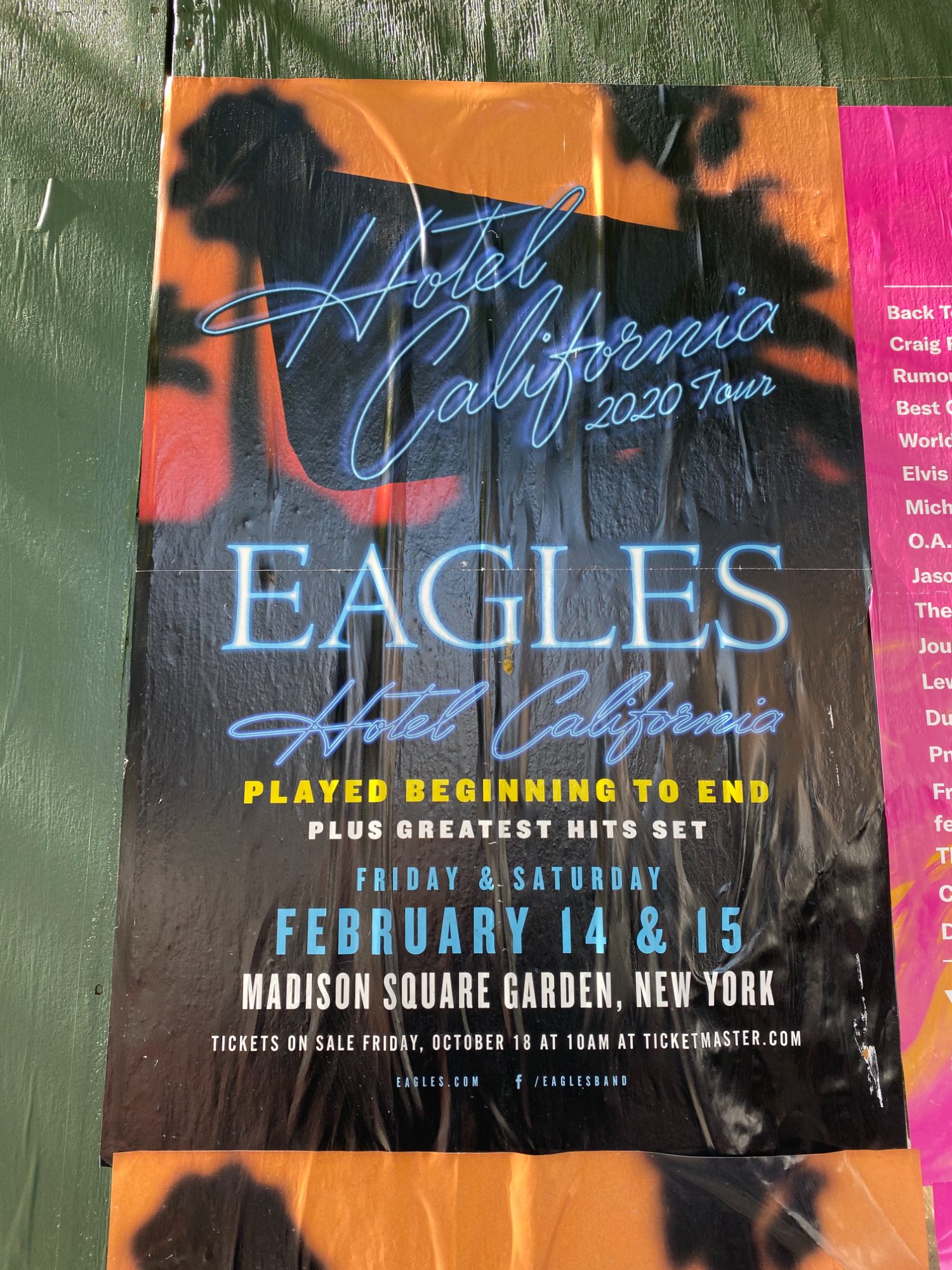| 001 | Eagles concert poster with visible text 'Tickets on Sale Friday, October 18' providing independent temporal verification of October 2019 documentation date | View | FLOOD_97GreenStG21_001_EaglesPoster_TemporalMarker.jpeg | IMG_0192.jpeg | October 2019 (Attorney Sherman) | GOOD | HIGH |