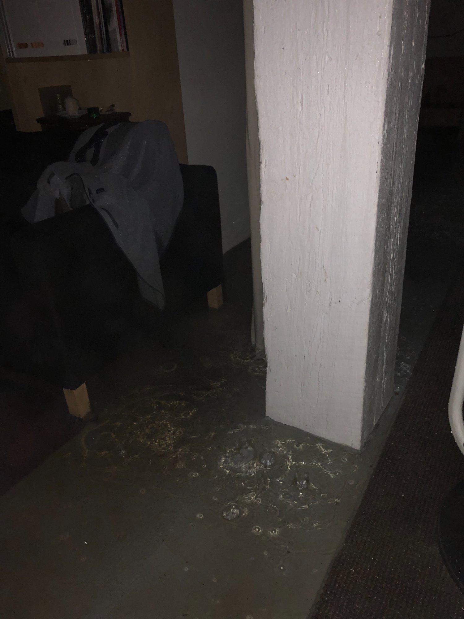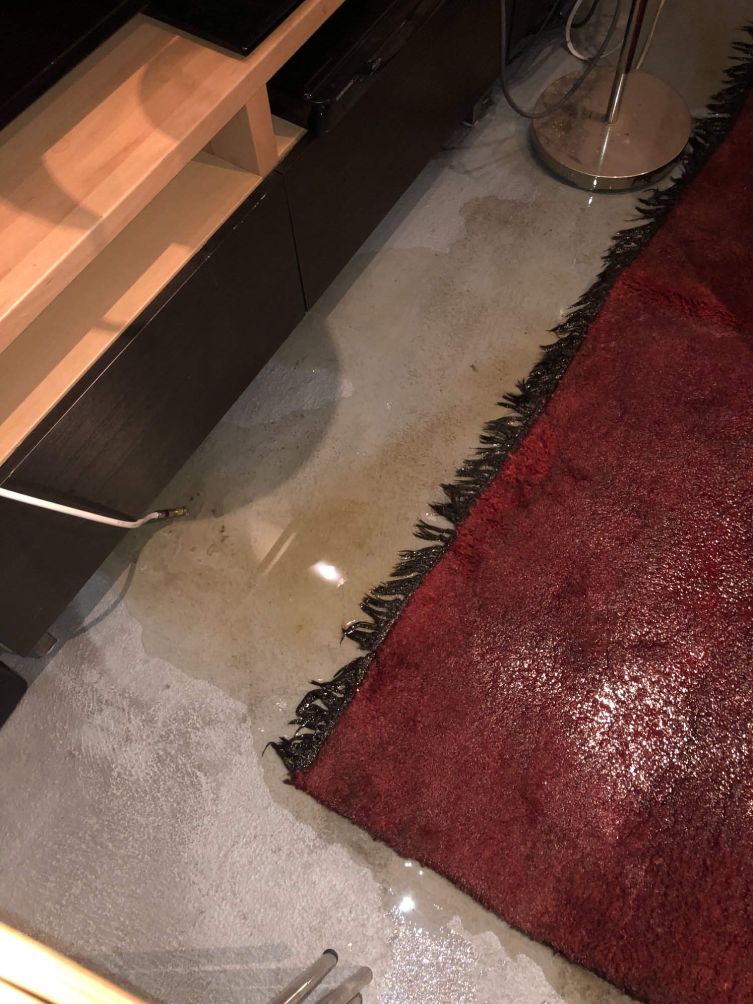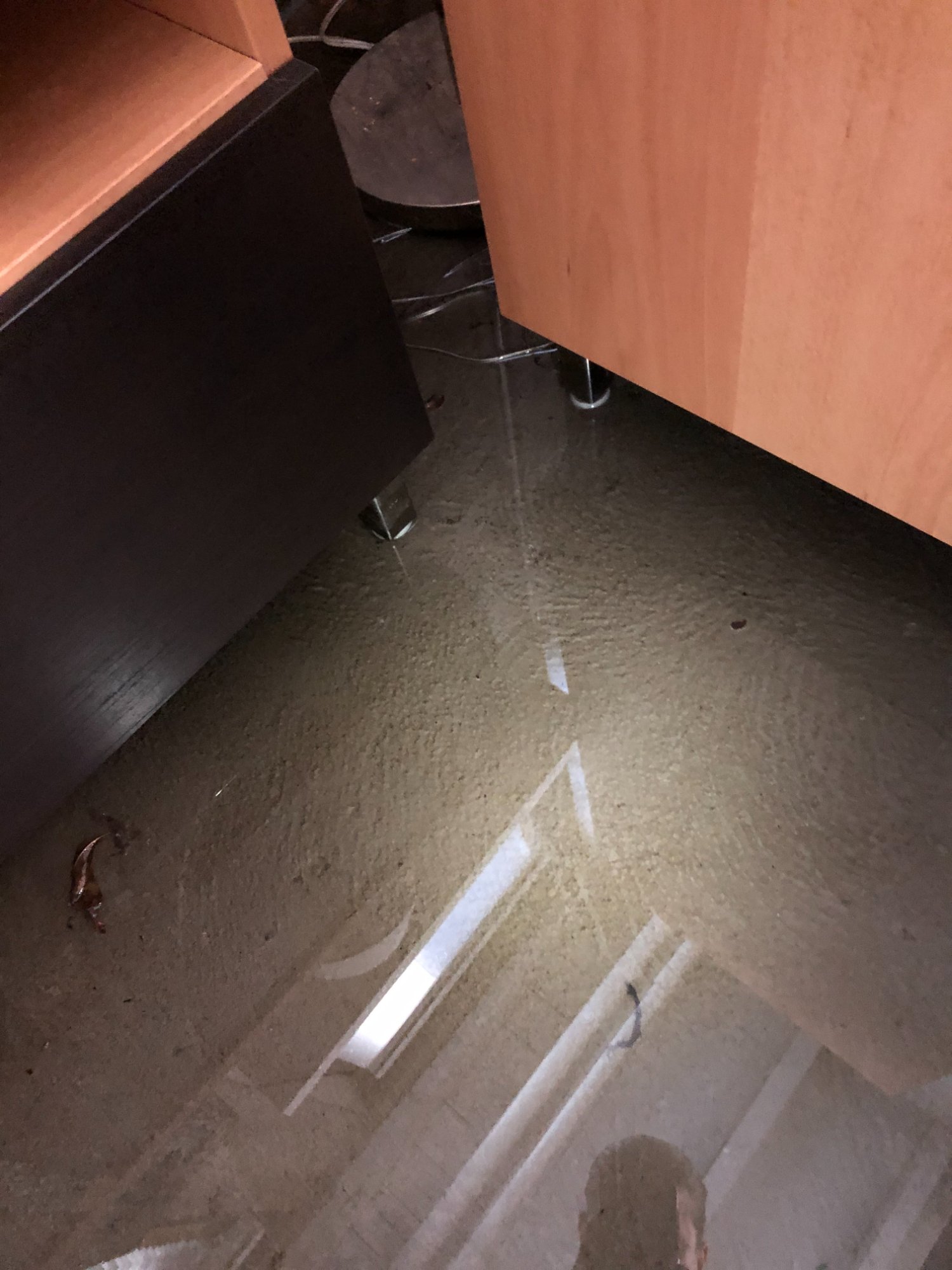 | 027 | Standing water on concrete floor with window light reflection; under TV console area; barstool base visible in water | View | FLOOD_97GreenStG21_027_Floor_StandingWater_WindowReflection.jpeg | IMG_4197.jpeg | October 2019 (Attorney Sherman) | GOOD | HIGH |
