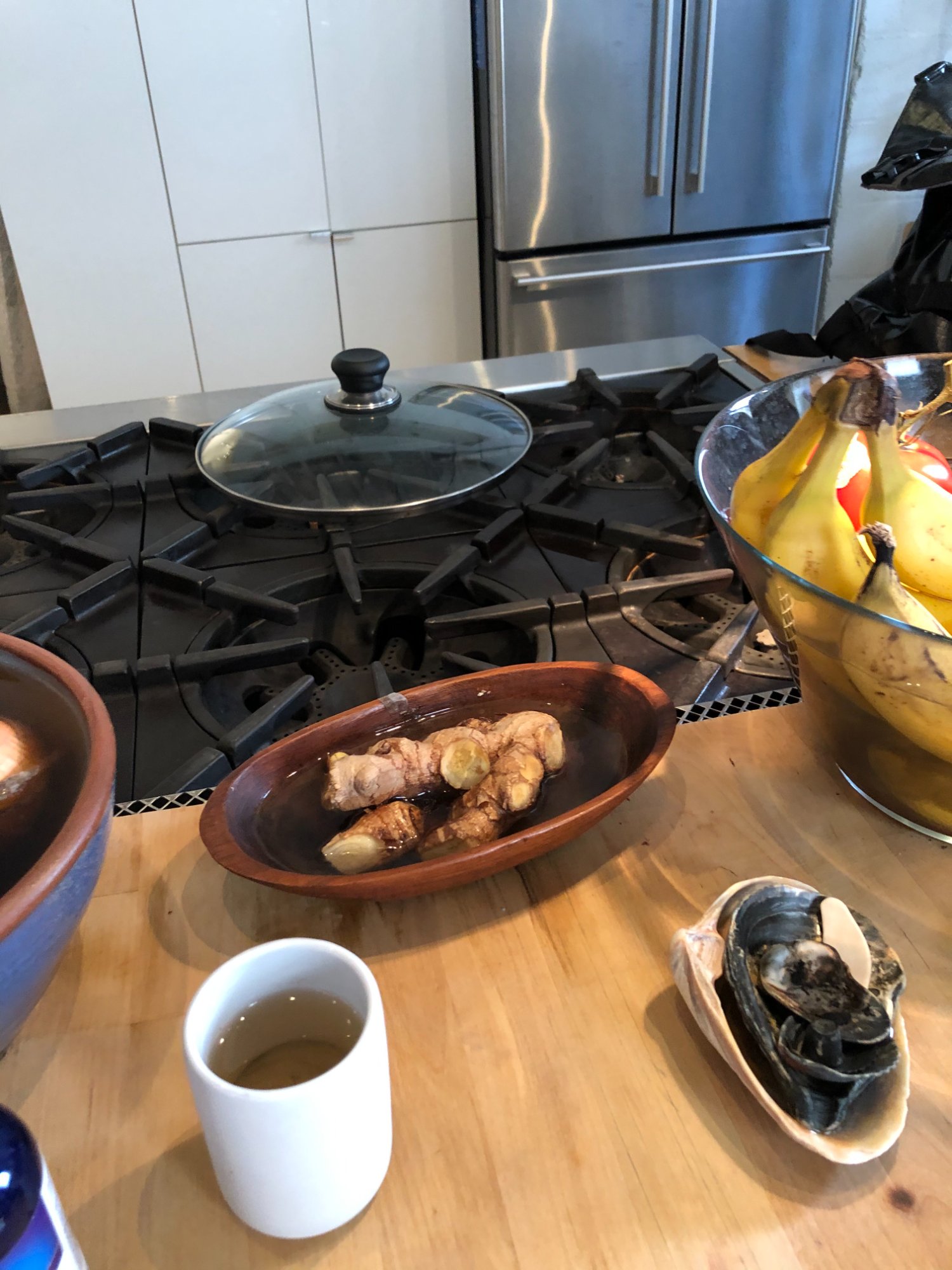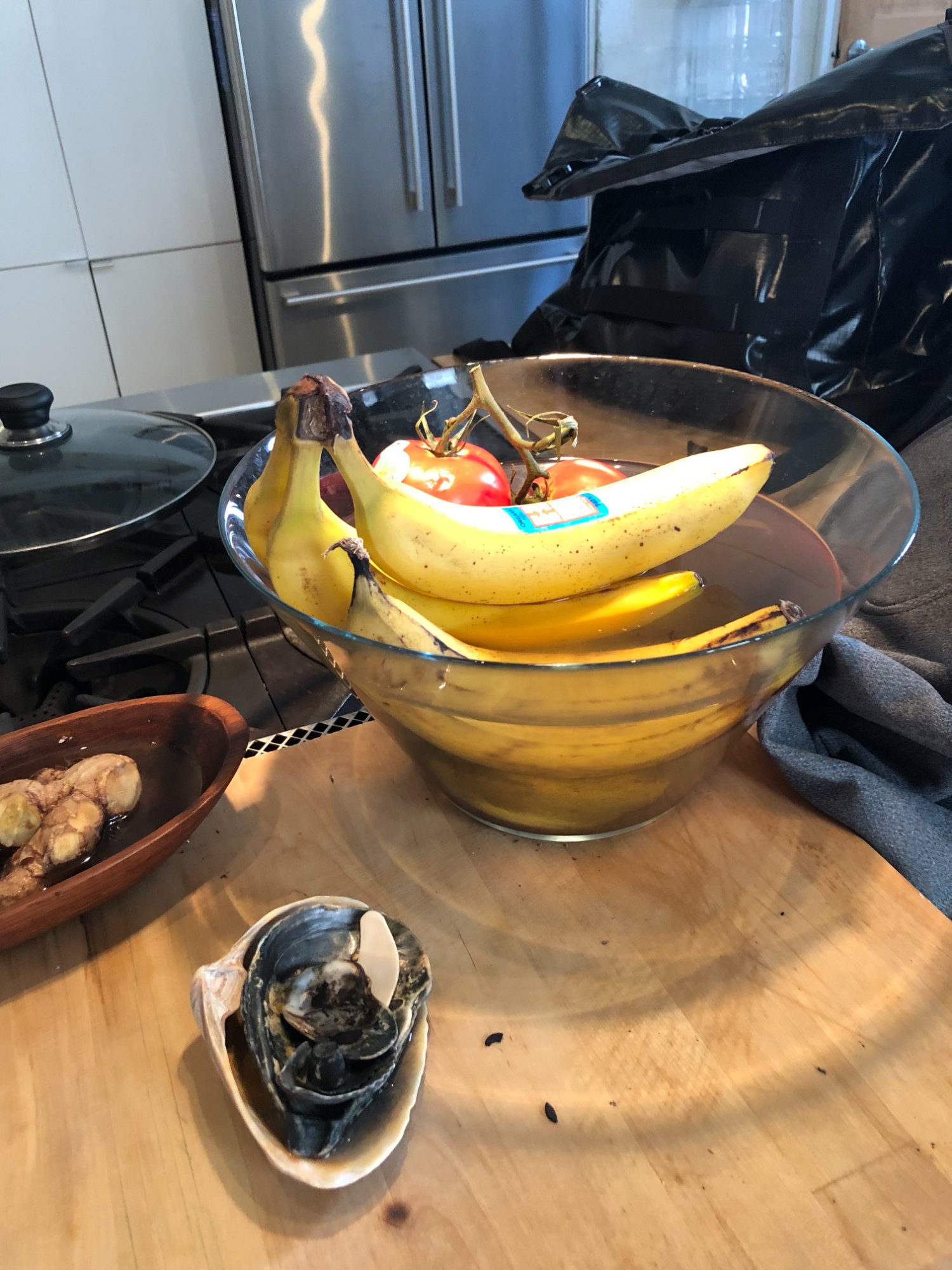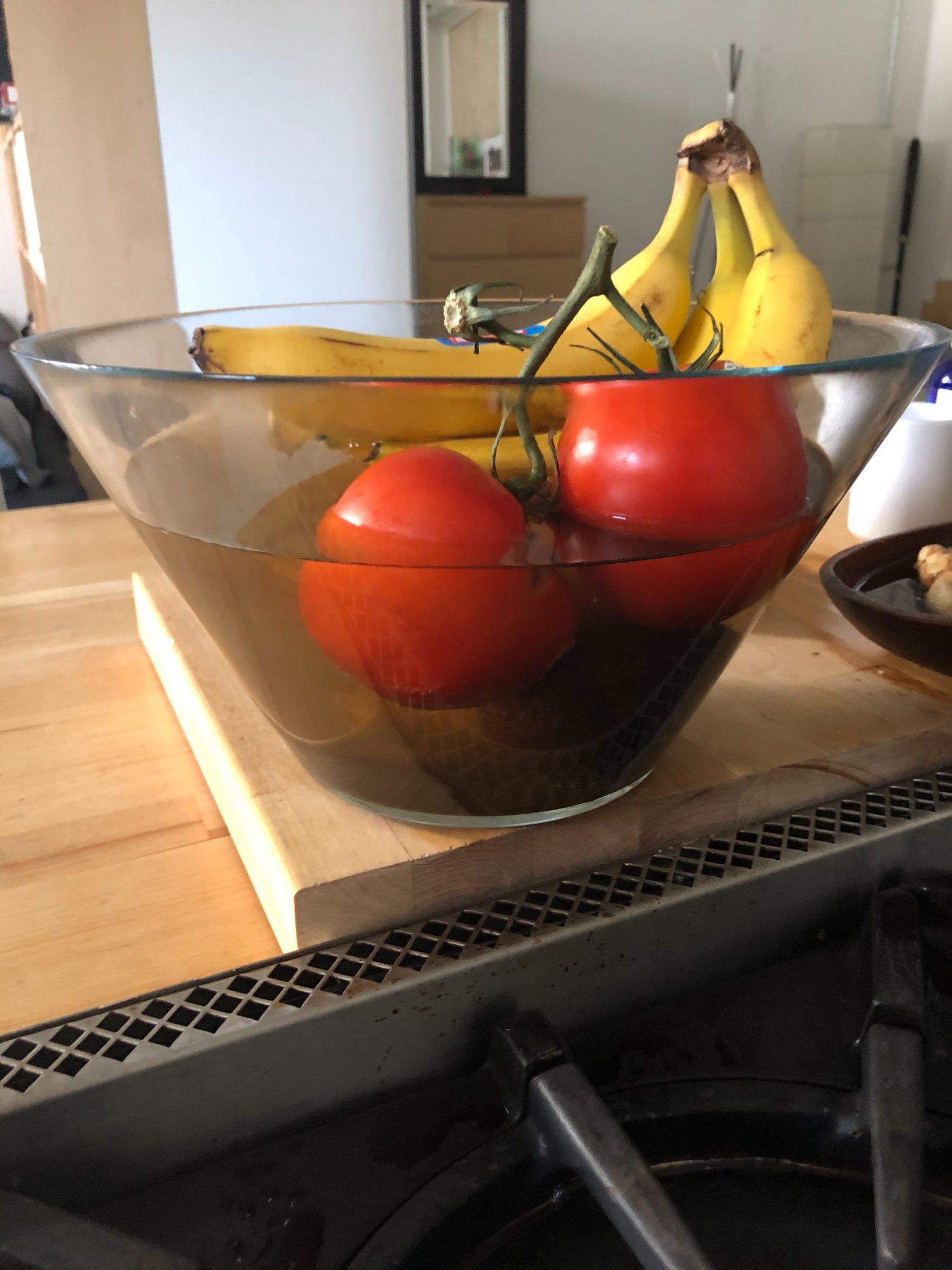 | 011 | Kitchen counter with glass fruit bowl (tomatoes, bananas) on butcher block near gas stove; living space context | View | FLOOD_97GreenStG21_011_Kitchen_FruitBowl_ContextShot.jpeg | IMG_4177.jpeg | October 2019 (Attorney Sherman) | GOOD | LOW |