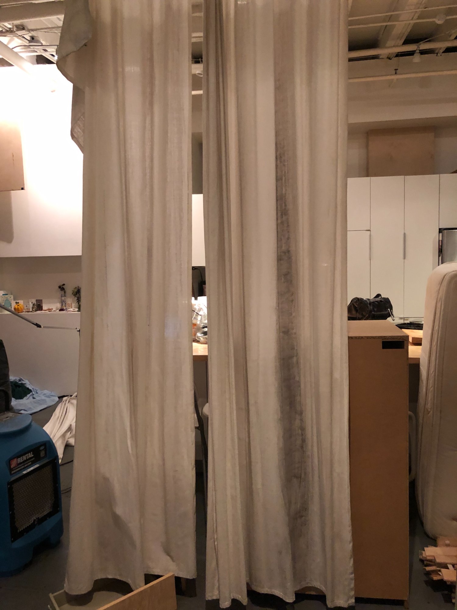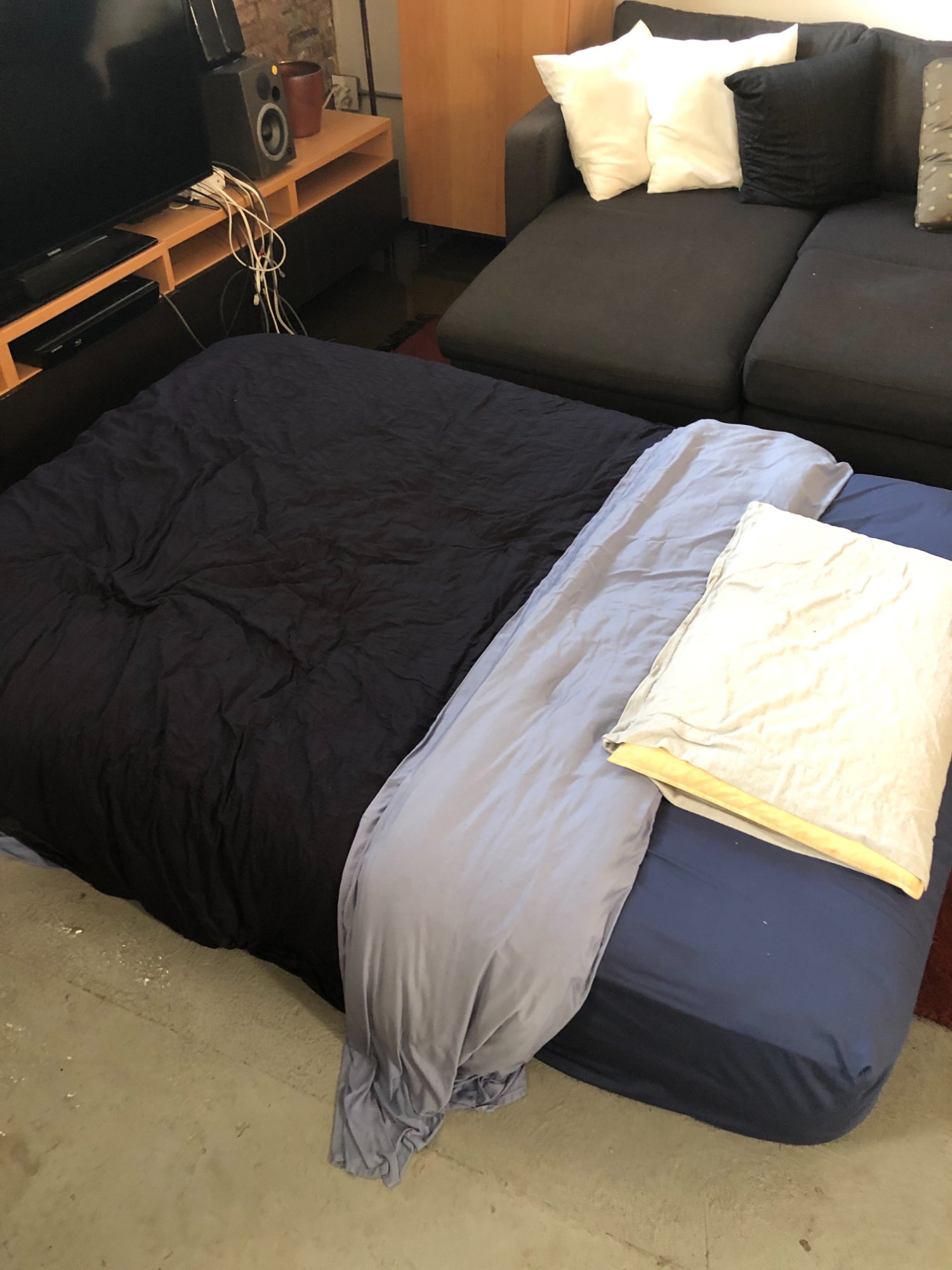 | 013 | Air mattress/inflatable bed set up in living area next to sectional couch; TV and studio monitor visible; displacement sleeping arrangement | View | FLOOD_97GreenStG21_013_LivingArea_AirMattress_Displacement.jpeg | IMG_4183.jpeg | October 2019 (Attorney Sherman) | GOOD | HIGH |