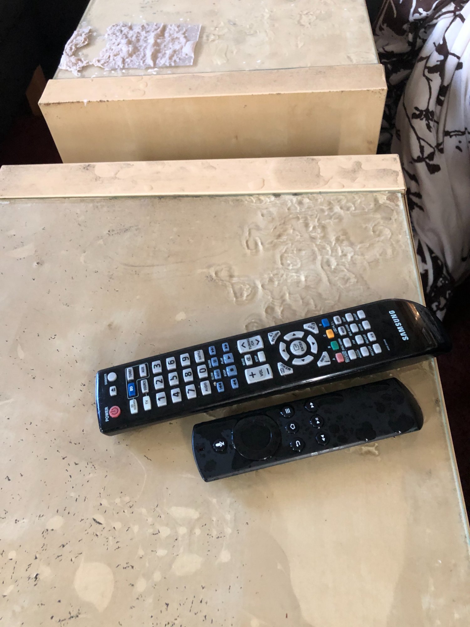 | 014 | Travertine coffee table with Samsung and Fire TV remotes; visible water staining and mineral deposits on stone surface | View | FLOOD_97GreenStG21_014_CoffeeTable_WaterStaining_Remotes.jpeg | IMG_4184.jpeg | October 2019 (Attorney Sherman) | GOOD | HIGH |