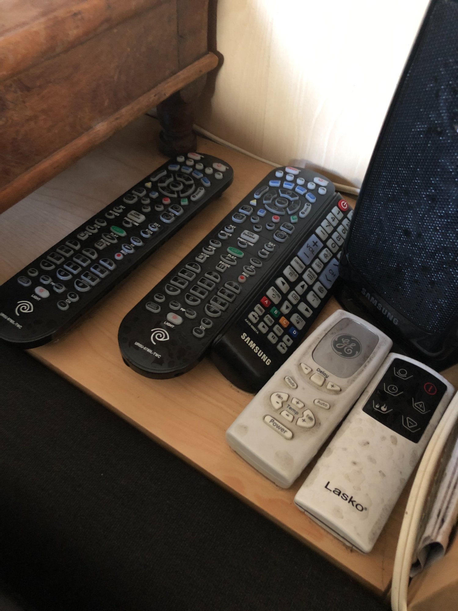 | 015 | Nightstand/shelf with multiple remotes (Spectrum cable, Samsung TV, GE AC, Lasko fan); water staining visible; Samsung speaker | View | FLOOD_97GreenStG21_015_Nightstand_MultipleRemotes_WaterStaining.jpeg | IMG_4185.jpeg | October 2019 (Attorney Sherman) | GOOD | MEDIUM |