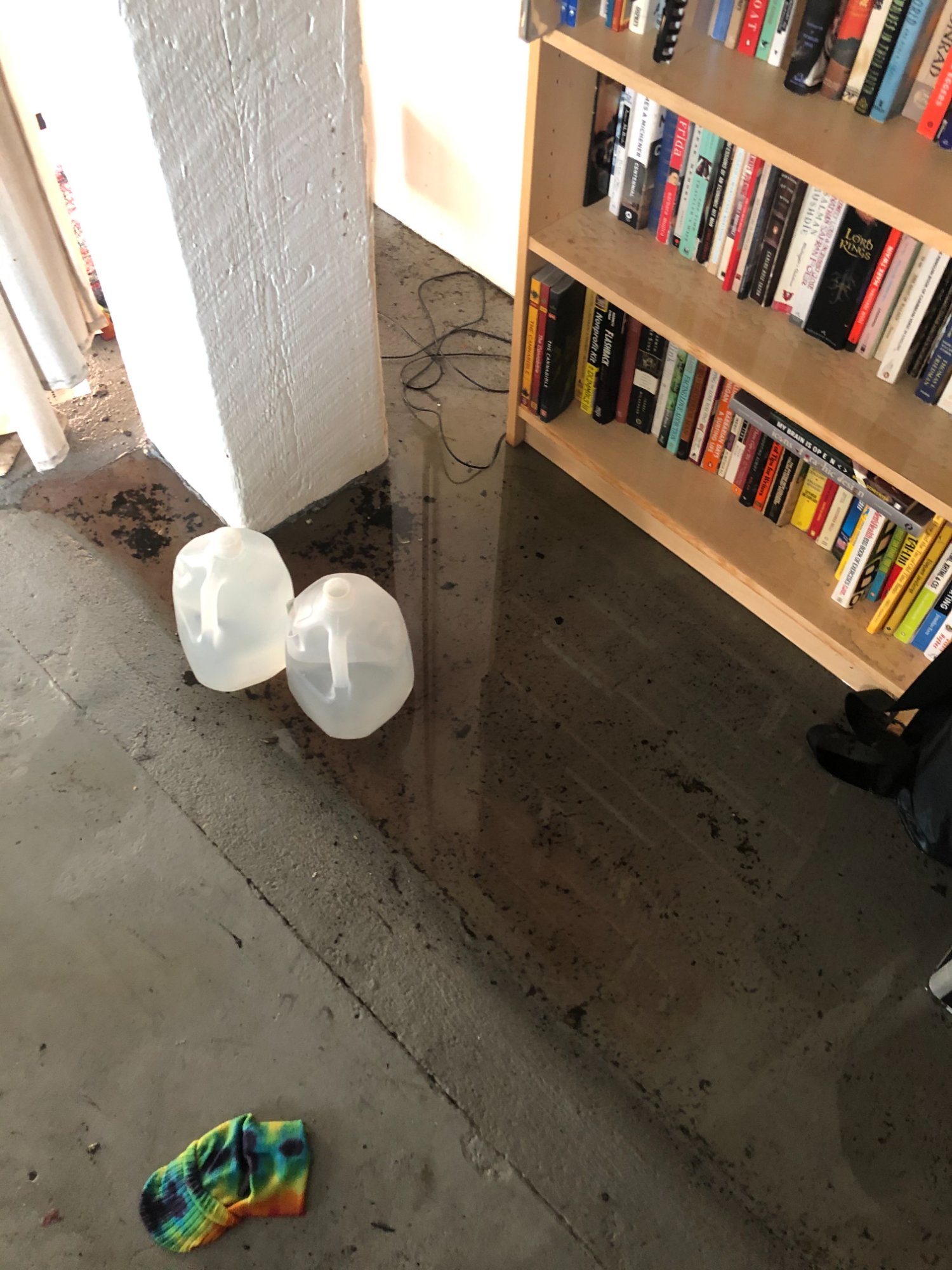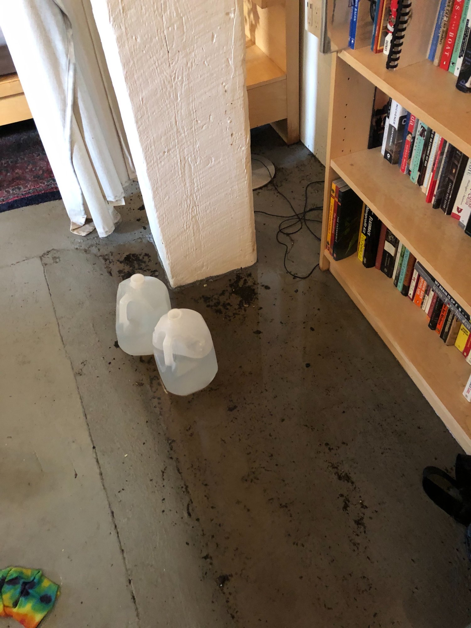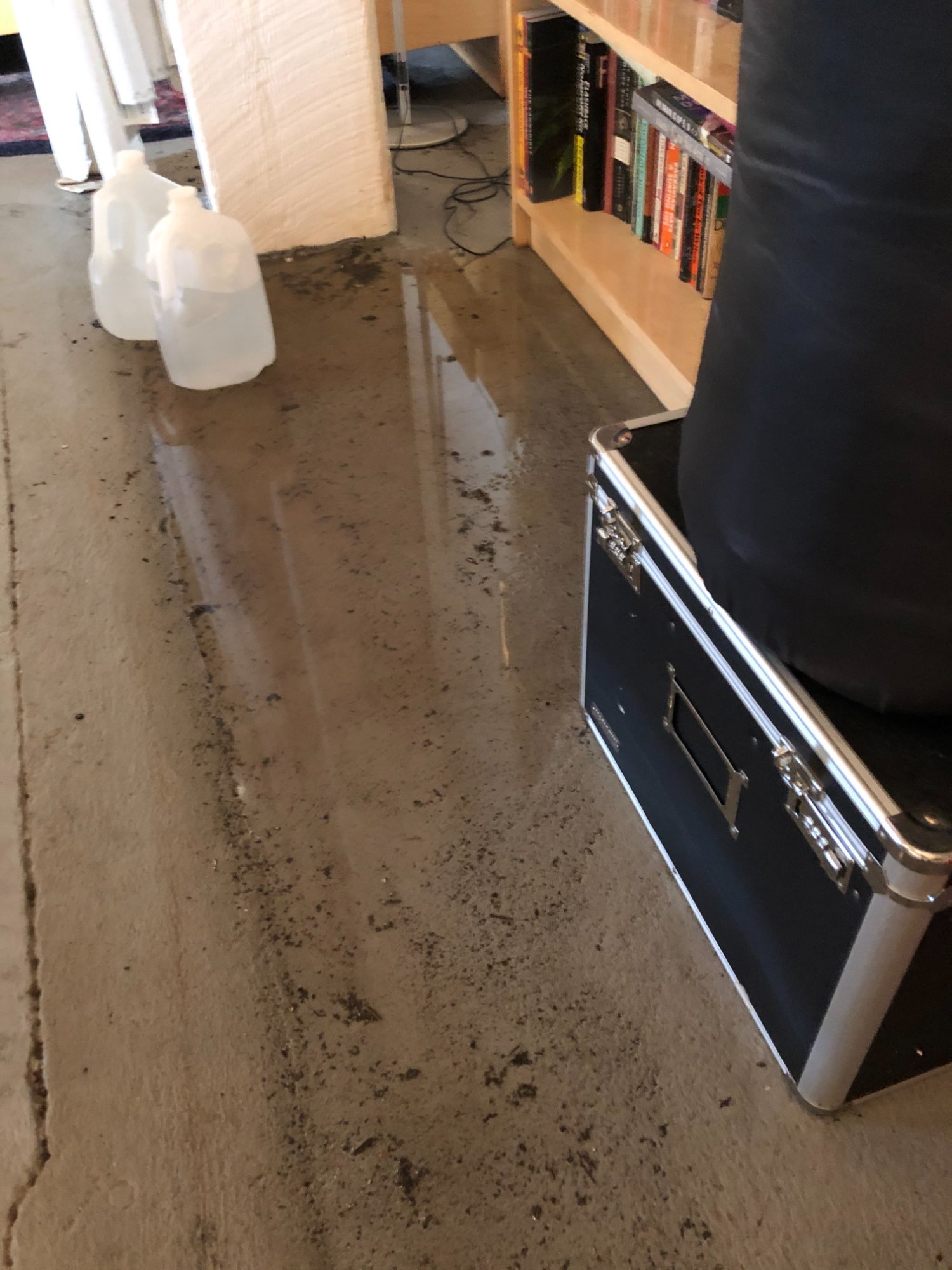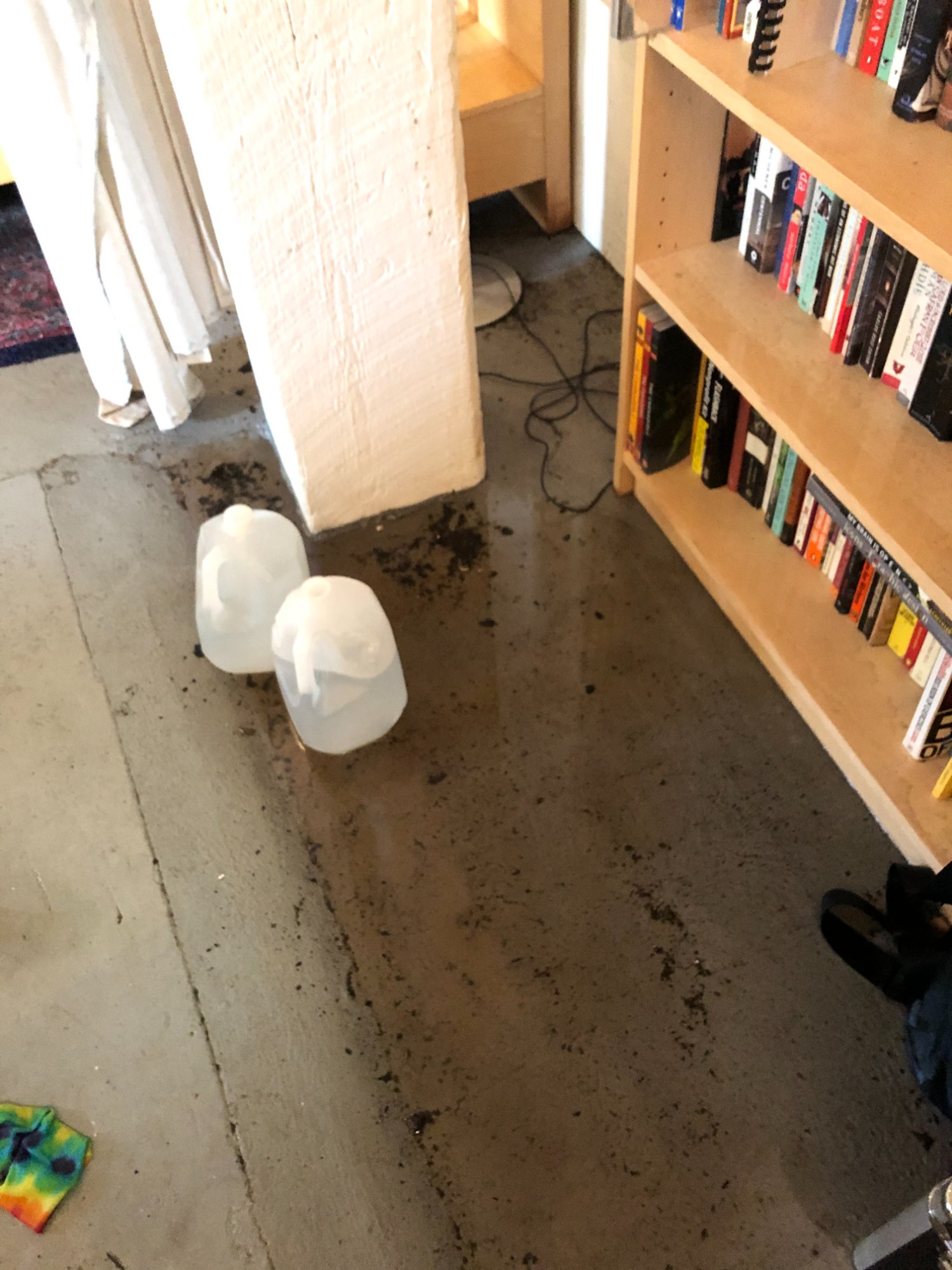 | 017 | Bookshelf near white structural column; standing water on concrete floor with debris; water jugs visible; cables in water | View | FLOOD_97GreenStG21_017_LivingArea_Bookshelf_StandingWater.jpeg | IMG_4187.jpeg | October 2019 (Attorney Sherman) | GOOD | HIGH |