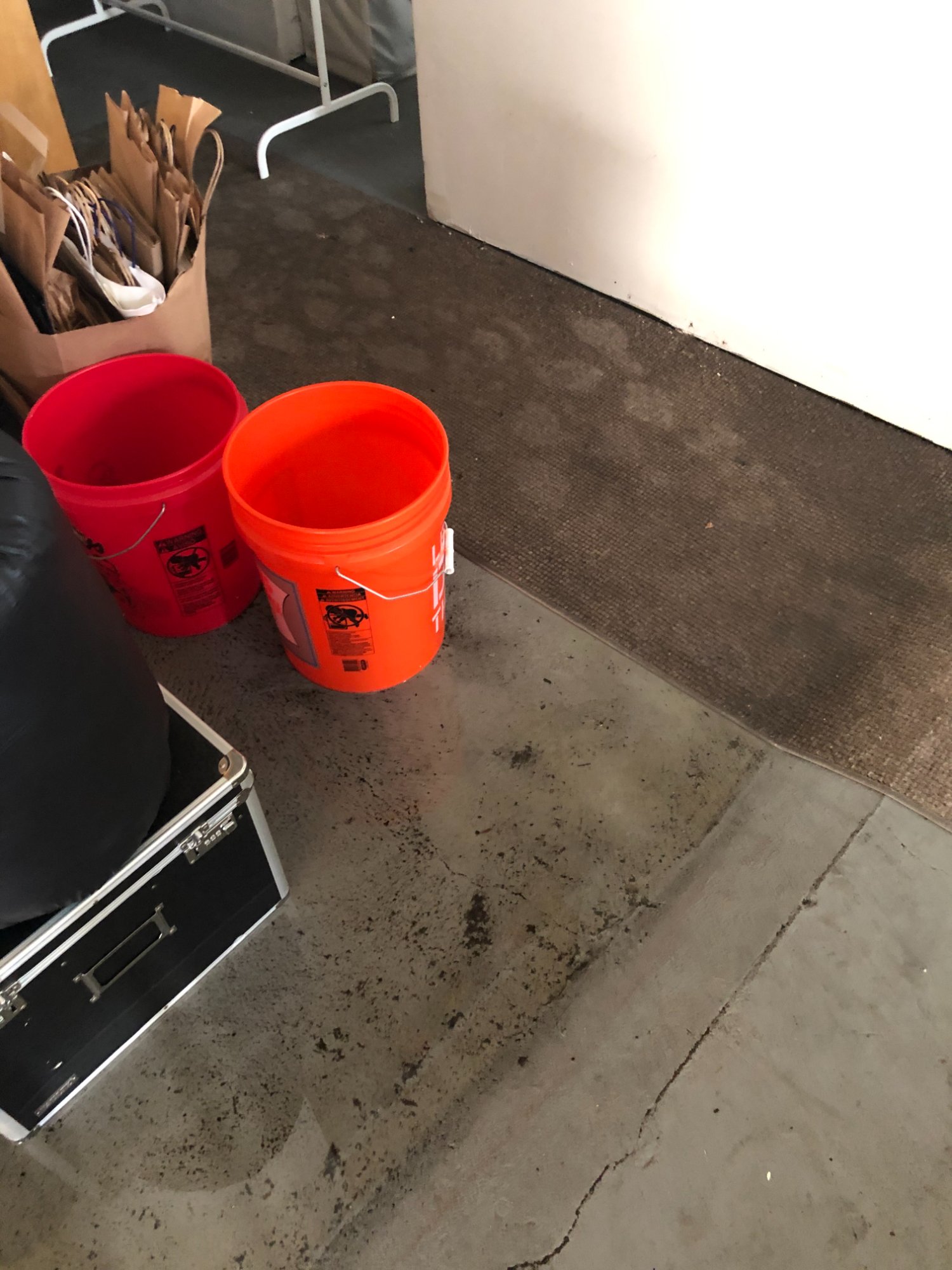 | 018 | Red and orange Home Depot 5-gallon buckets (salvage/mitigation); wet carpet/rug with water staining; road case visible | View | FLOOD_97GreenStG21_018_Hallway_HomeDepotBuckets_WetRug.jpeg | IMG_4188.jpeg | October 2019 (Attorney Sherman) | GOOD | HIGH |
