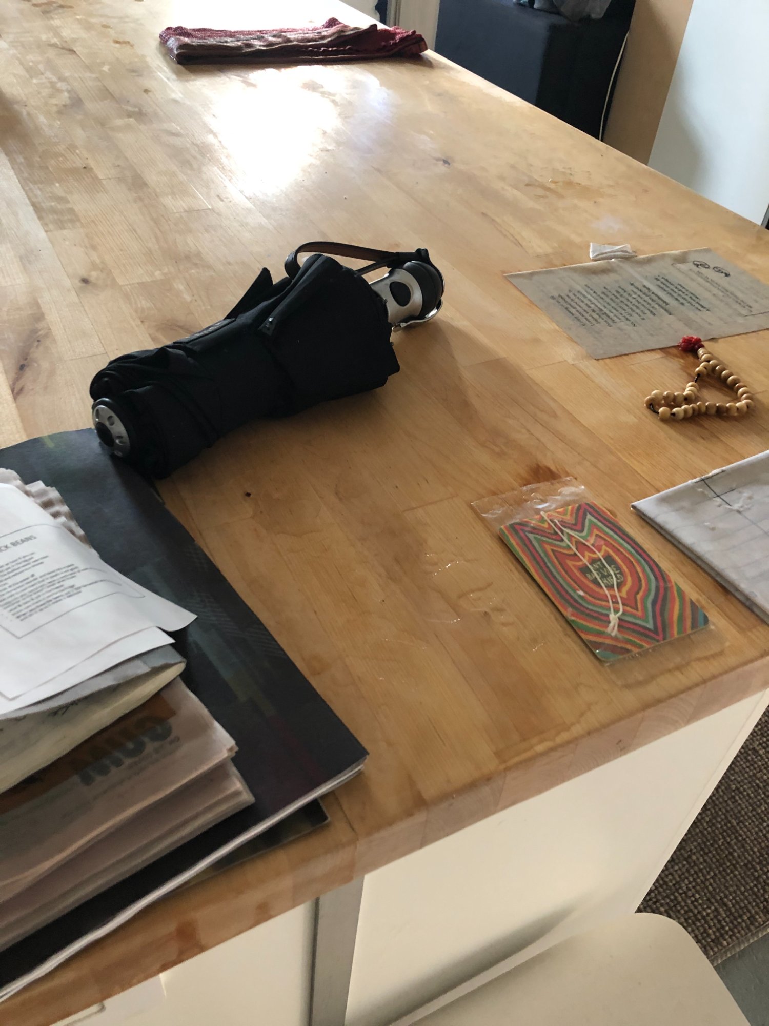 | 019 | Kitchen island/counter with umbrella, stacked papers and documents; water staining visible on butcher block surface | View | FLOOD_97GreenStG21_019_KitchenIsland_WaterStaining_Papers.jpeg | IMG_4189.jpeg | October 2019 (Attorney Sherman) | GOOD | MEDIUM |