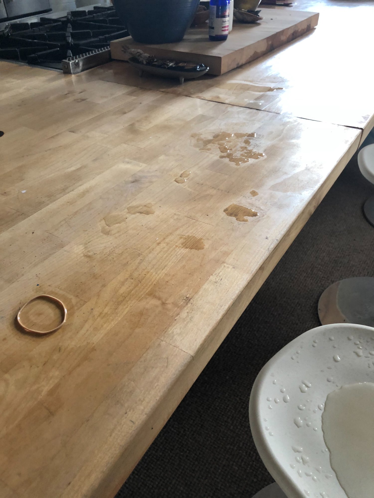 | 020 | Kitchen counter showing water droplets and pooling on butcher block surface; wet dishes/plates visible; active water intrusion evidence | View | FLOOD_97GreenStG21_020_KitchenCounter_WaterPooling_ActiveDrip.jpeg | IMG_4190.jpeg | October 2019 (Attorney Sherman) | GOOD | HIGH |