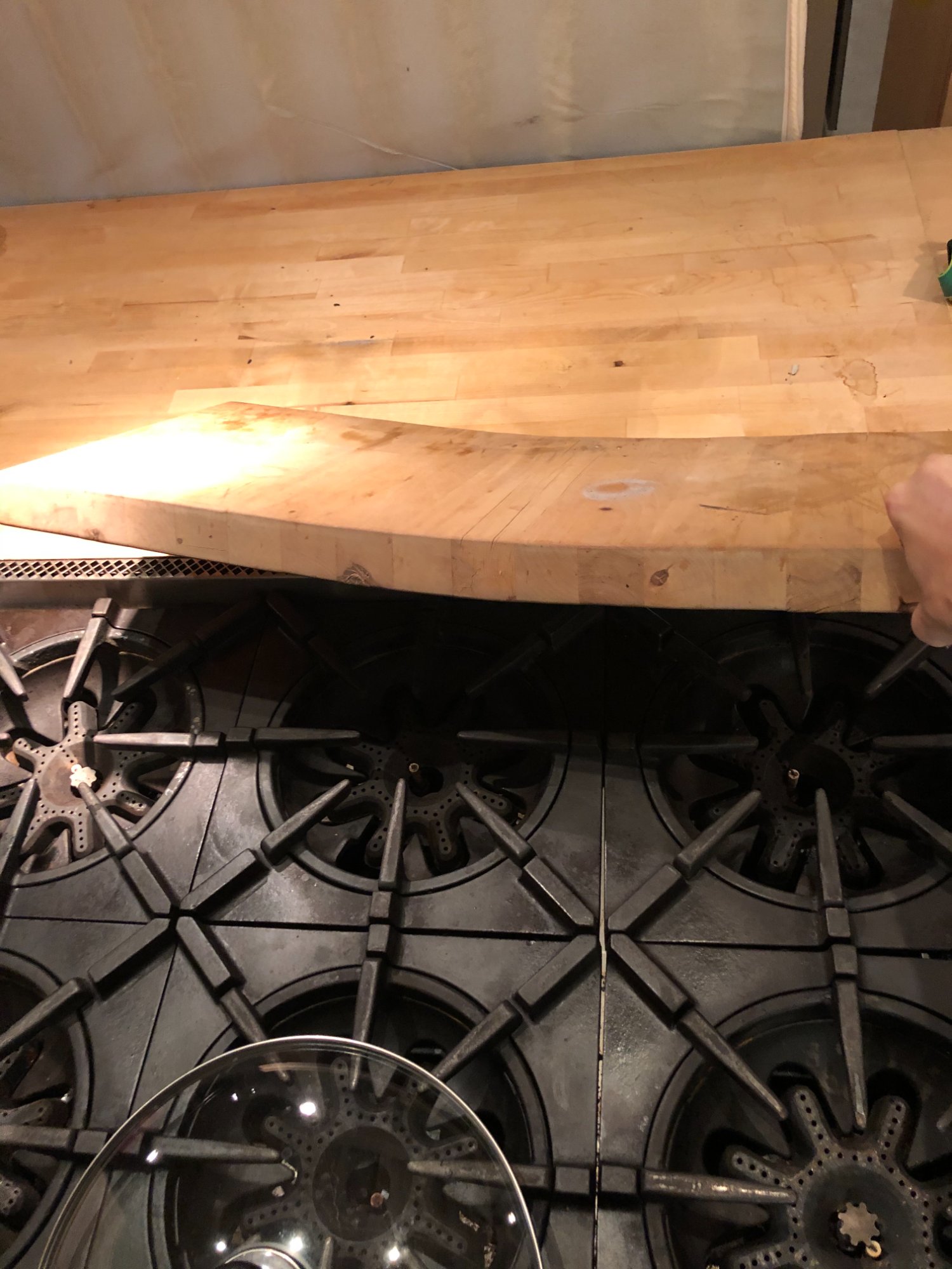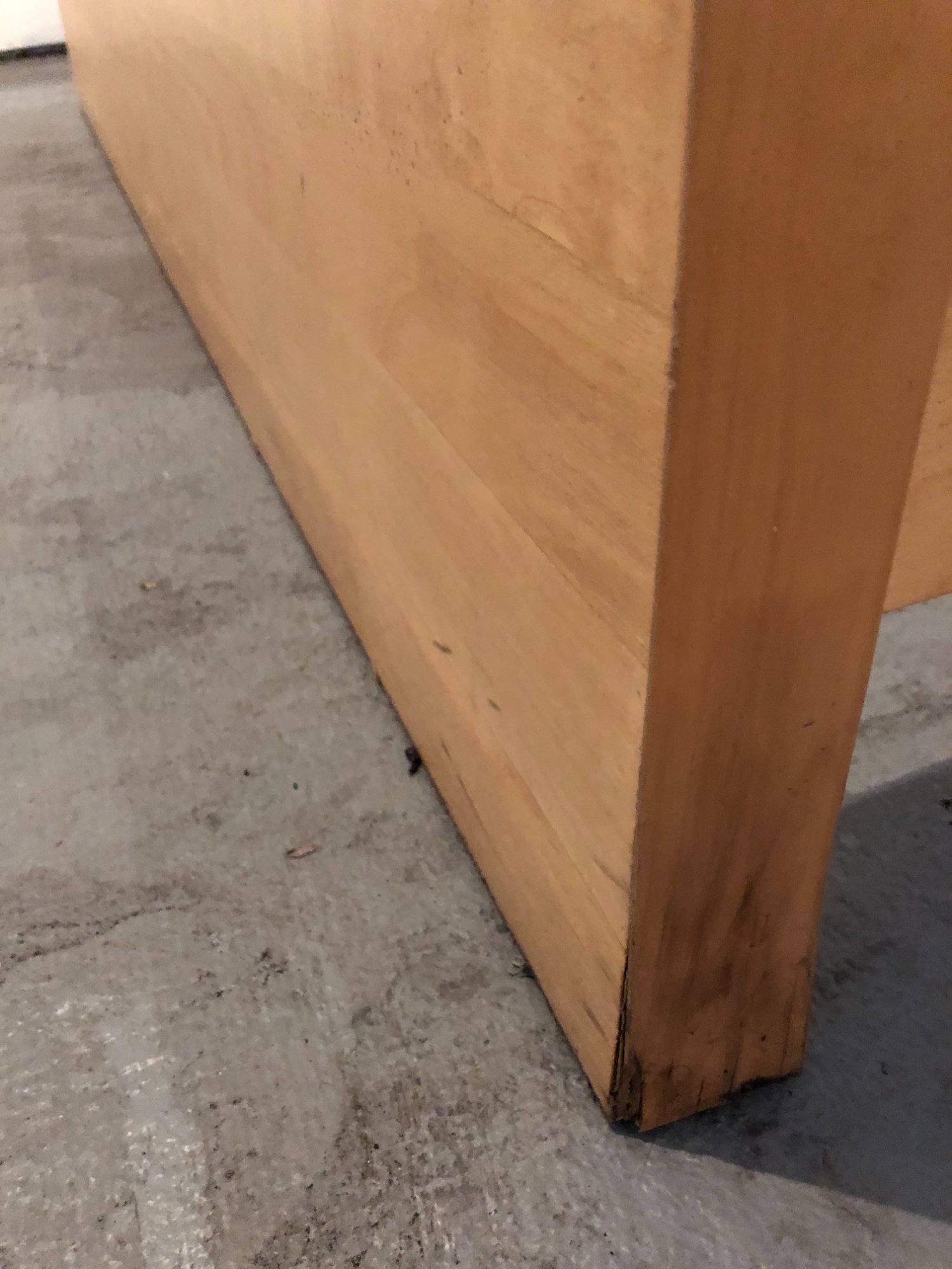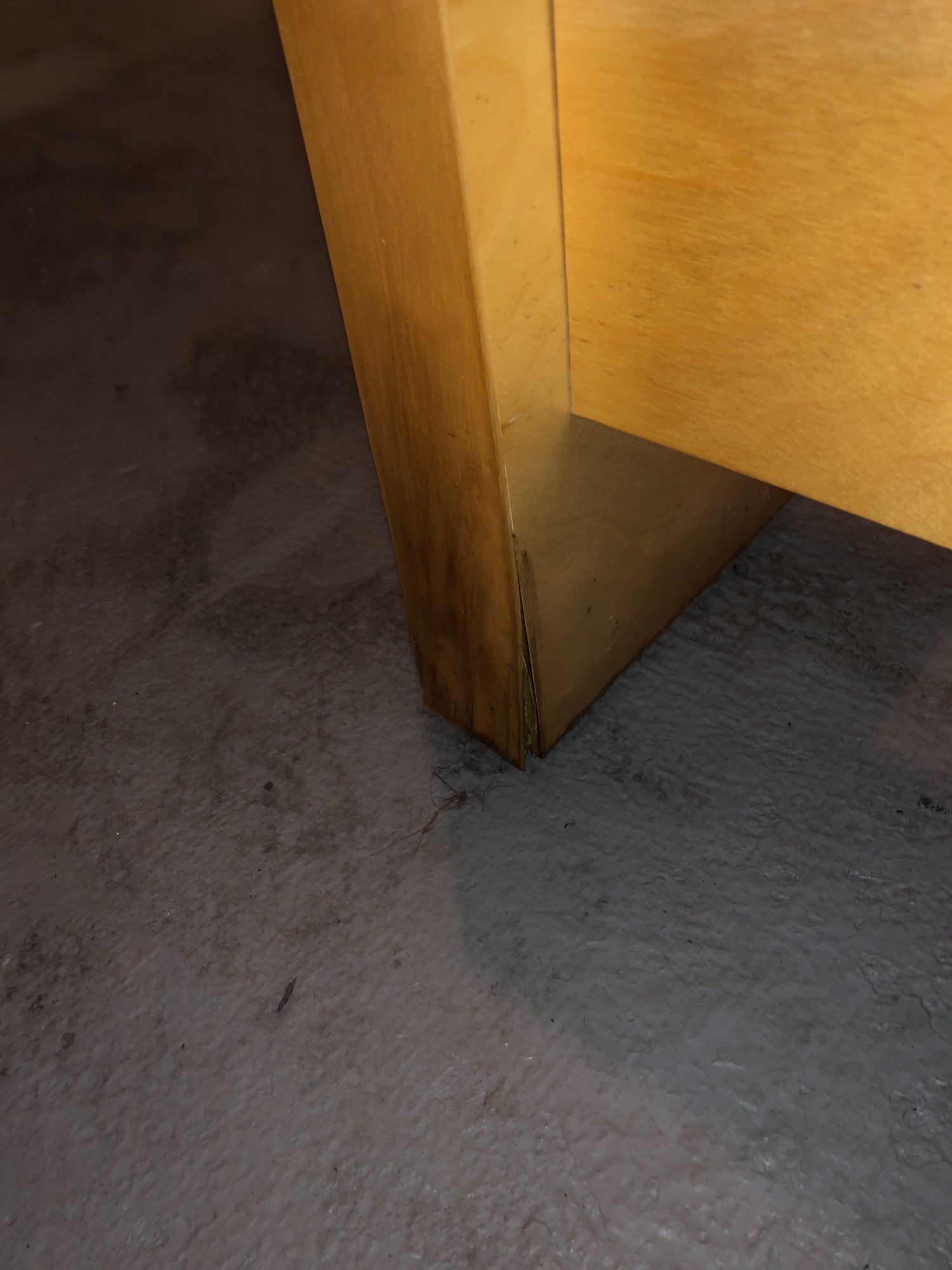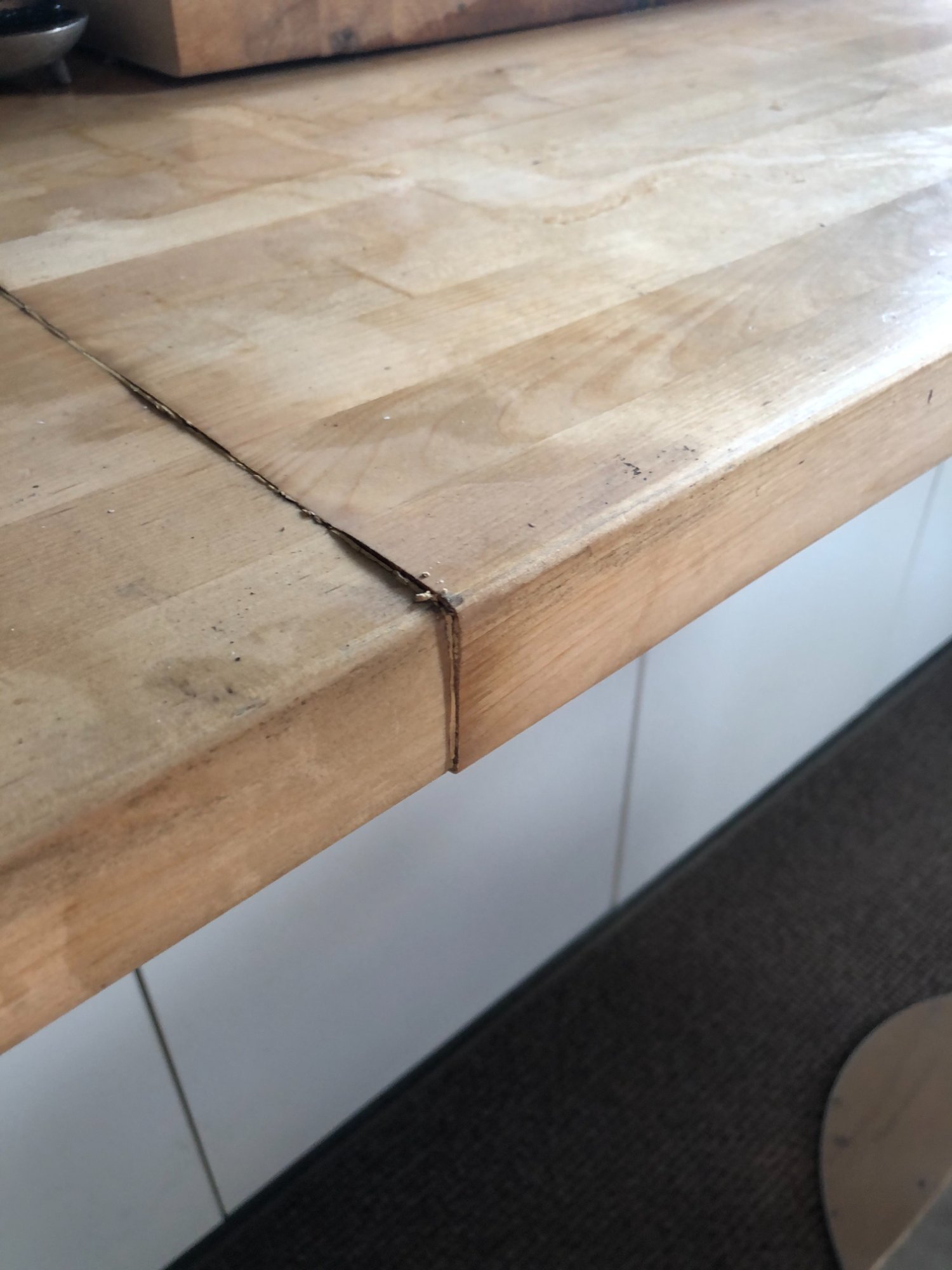 | 021 | Butcher block counter corner showing seam separation and joint damage from water exposure; structural wood damage | View | FLOOD_97GreenStG21_021_KitchenCounter_SeamSeparation_WaterDamage.jpeg | IMG_4191.jpeg | October 2019 (Attorney Sherman) | GOOD | HIGH |