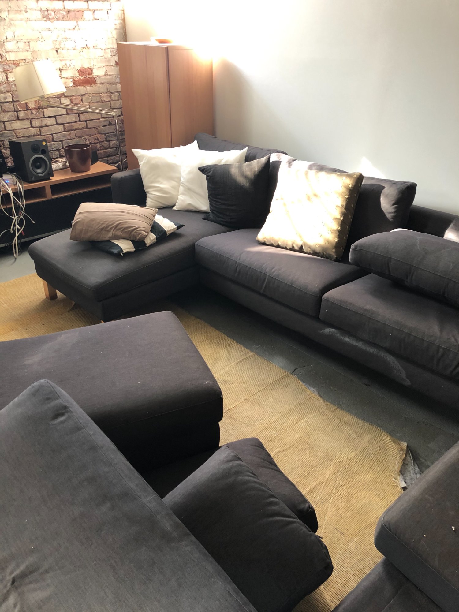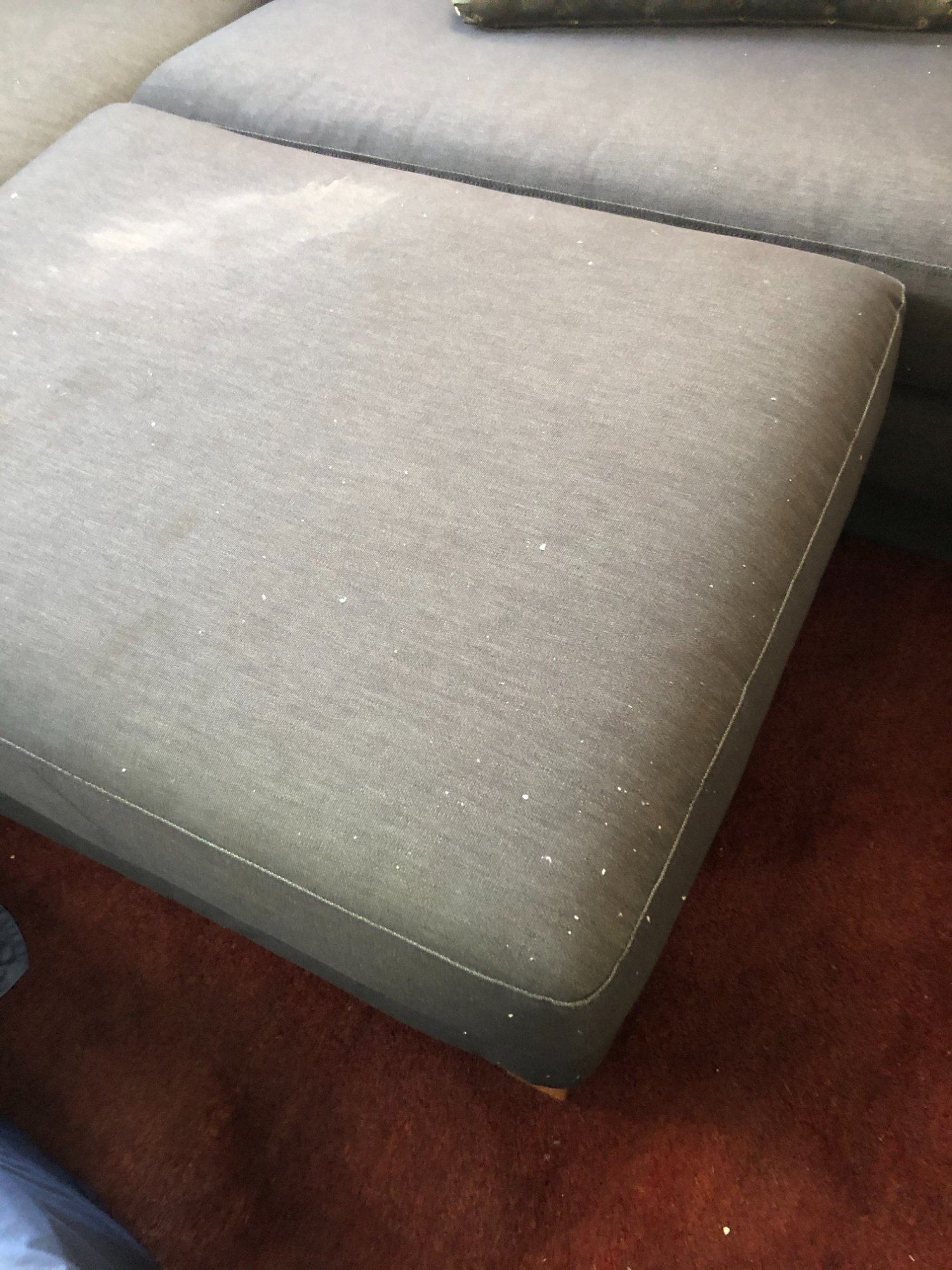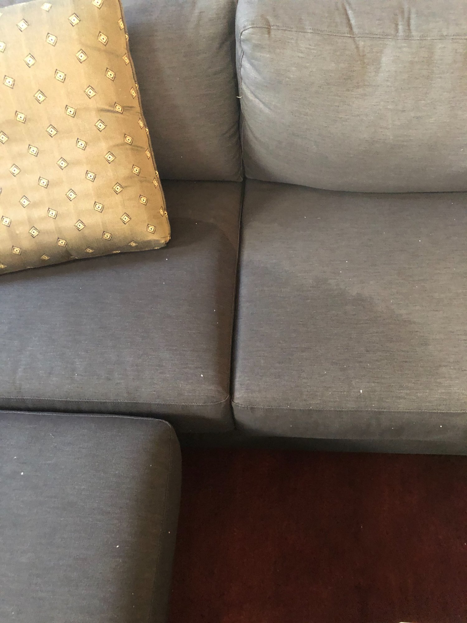 | 022 | Gray sectional couch close-up with decorative pillow; white debris/particles visible on fabric; burgundy rug beneath | View | FLOOD_97GreenStG21_022_Sectional_CloseUp_FabricDebris.jpeg | IMG_4192.jpeg | October 2019 (Attorney Sherman) | GOOD | MEDIUM |