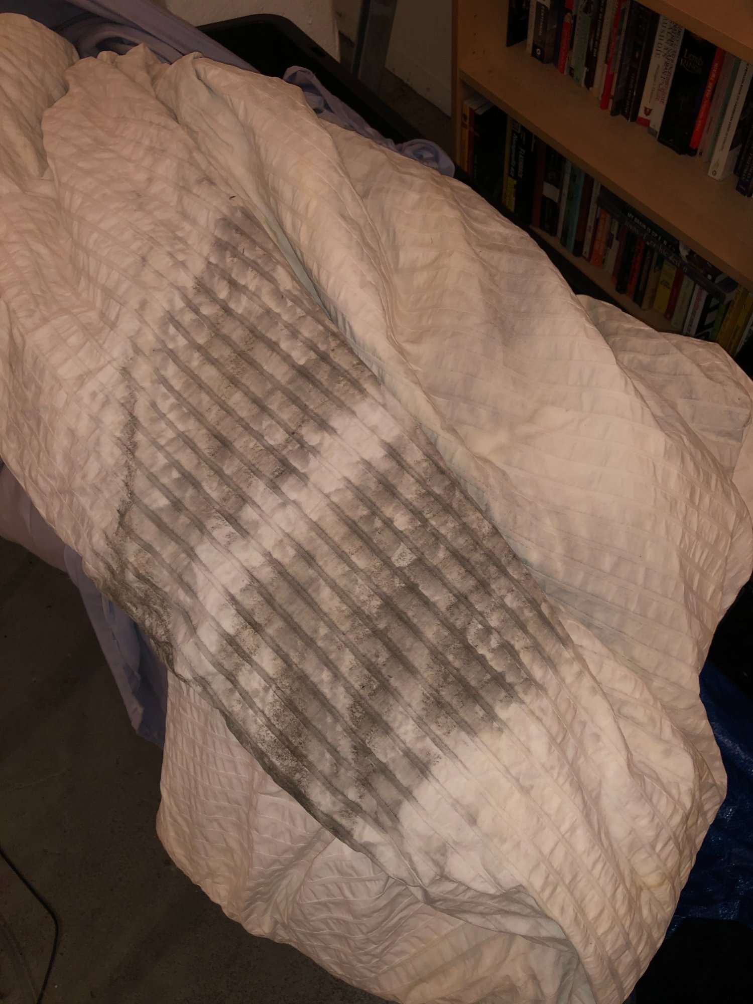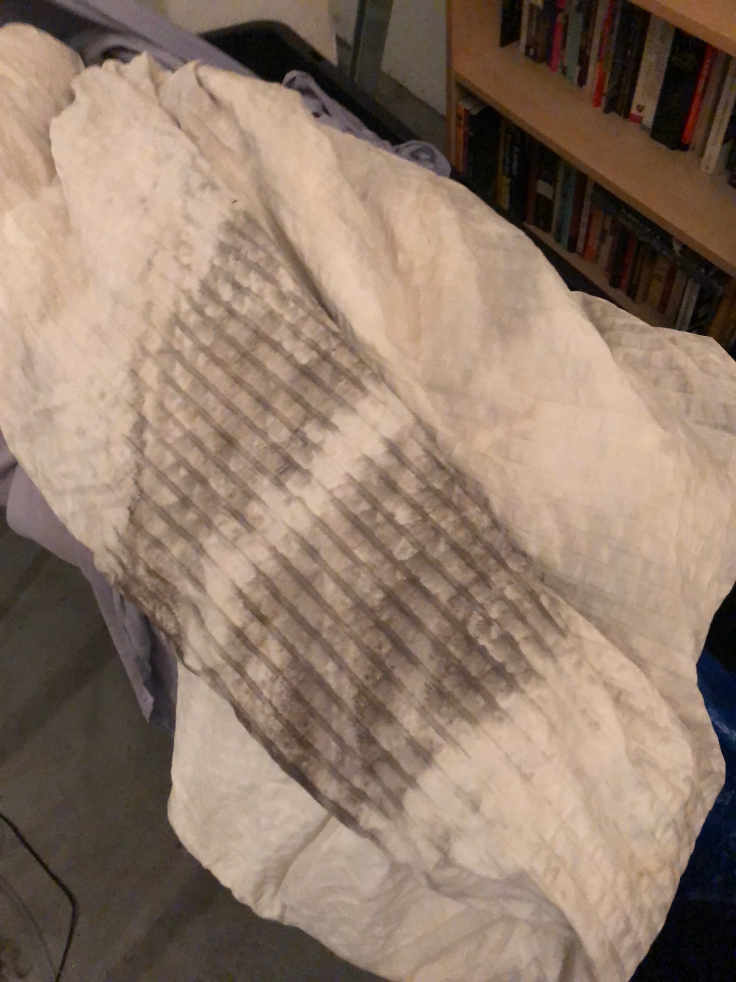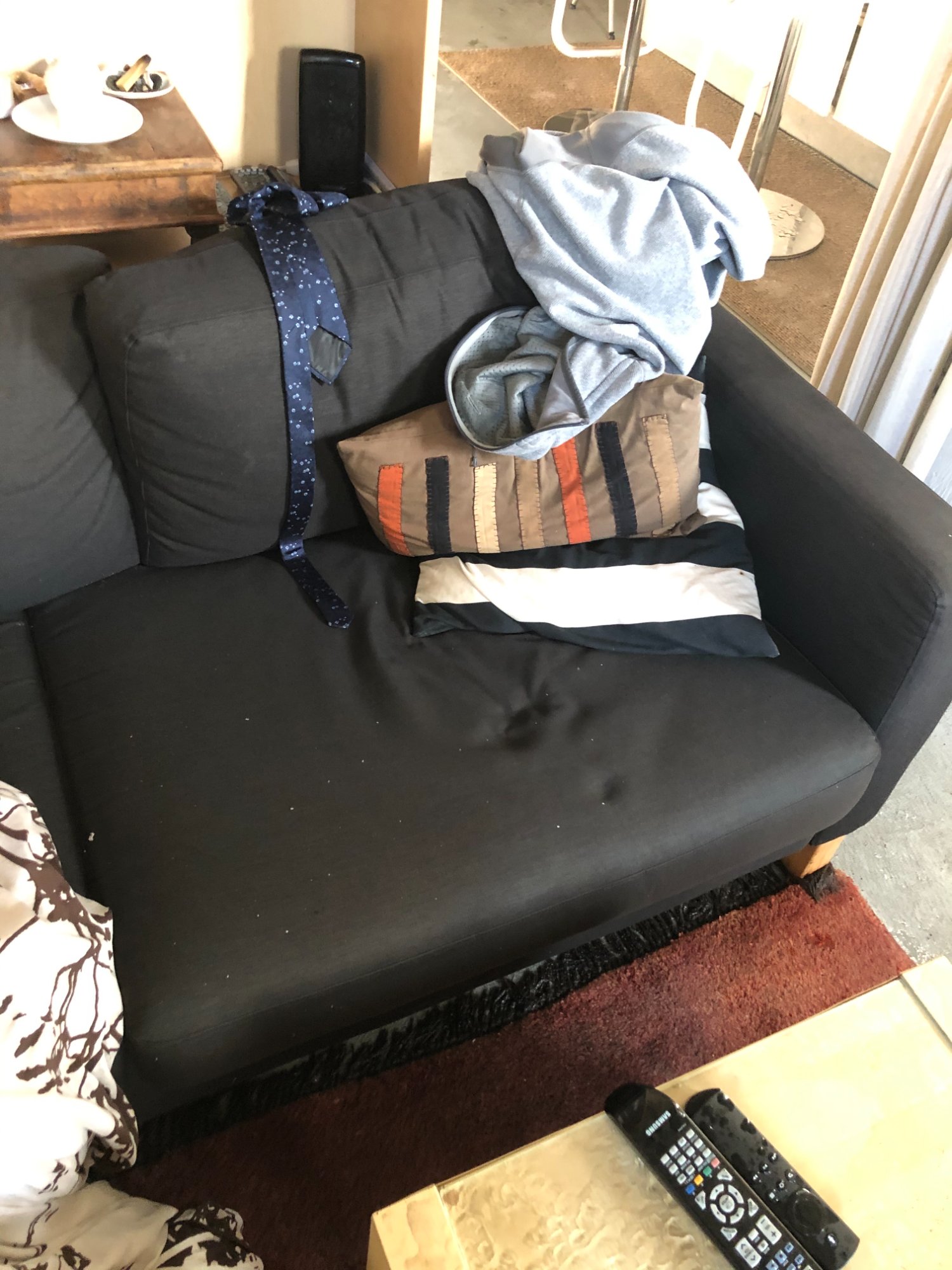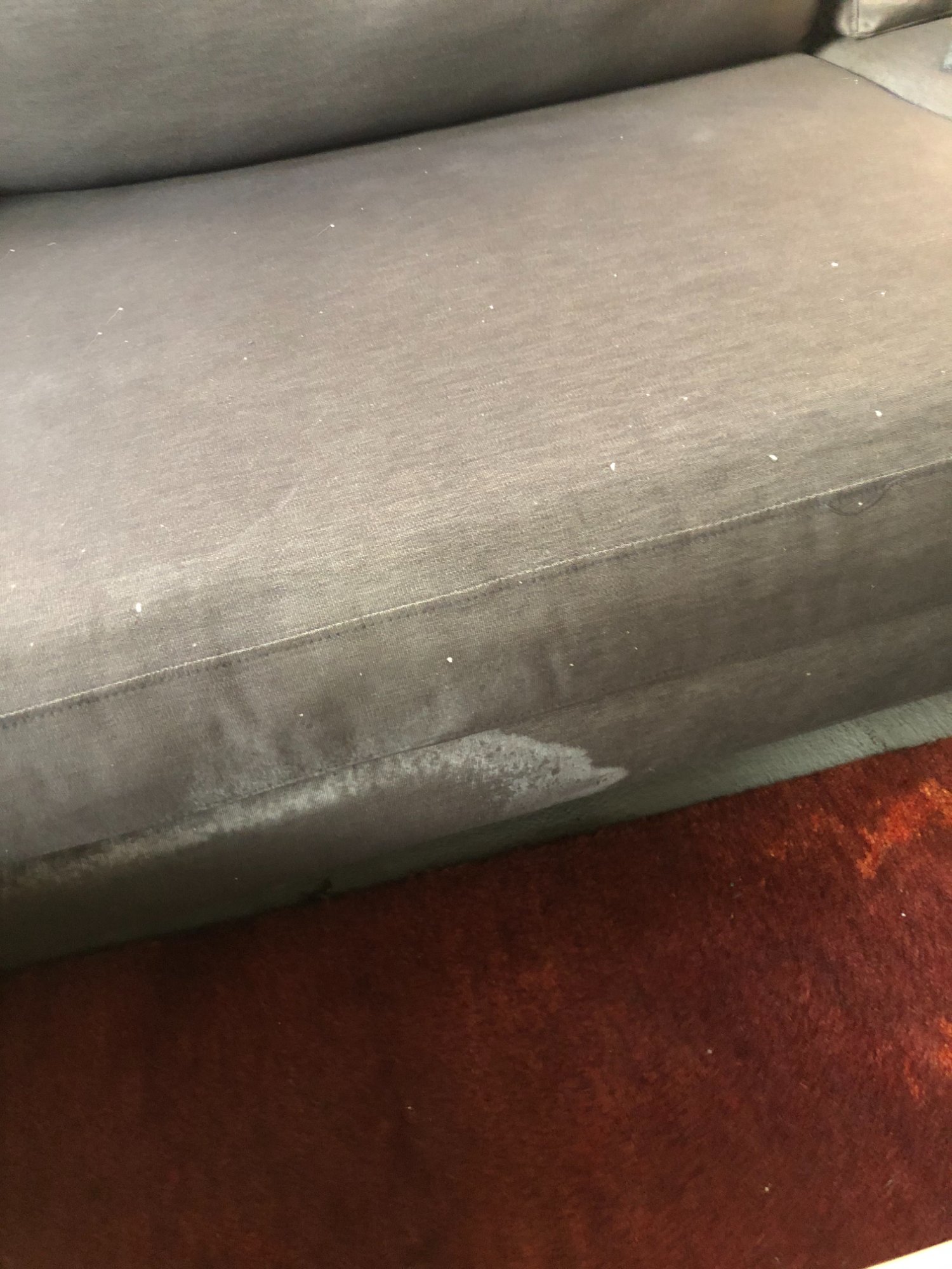 | 033 | Close-up of gray sectional sofa cushion bottom edge showing clear water tide line; dark staining visible along fabric where water reached; red rug visible below | View | FLOOD_97GreenStG21_033_Sectional_CushionEdge_WaterLine.jpeg | IMG_4203.jpeg | October 2019 (Attorney Sherman) | GOOD | HIGH |