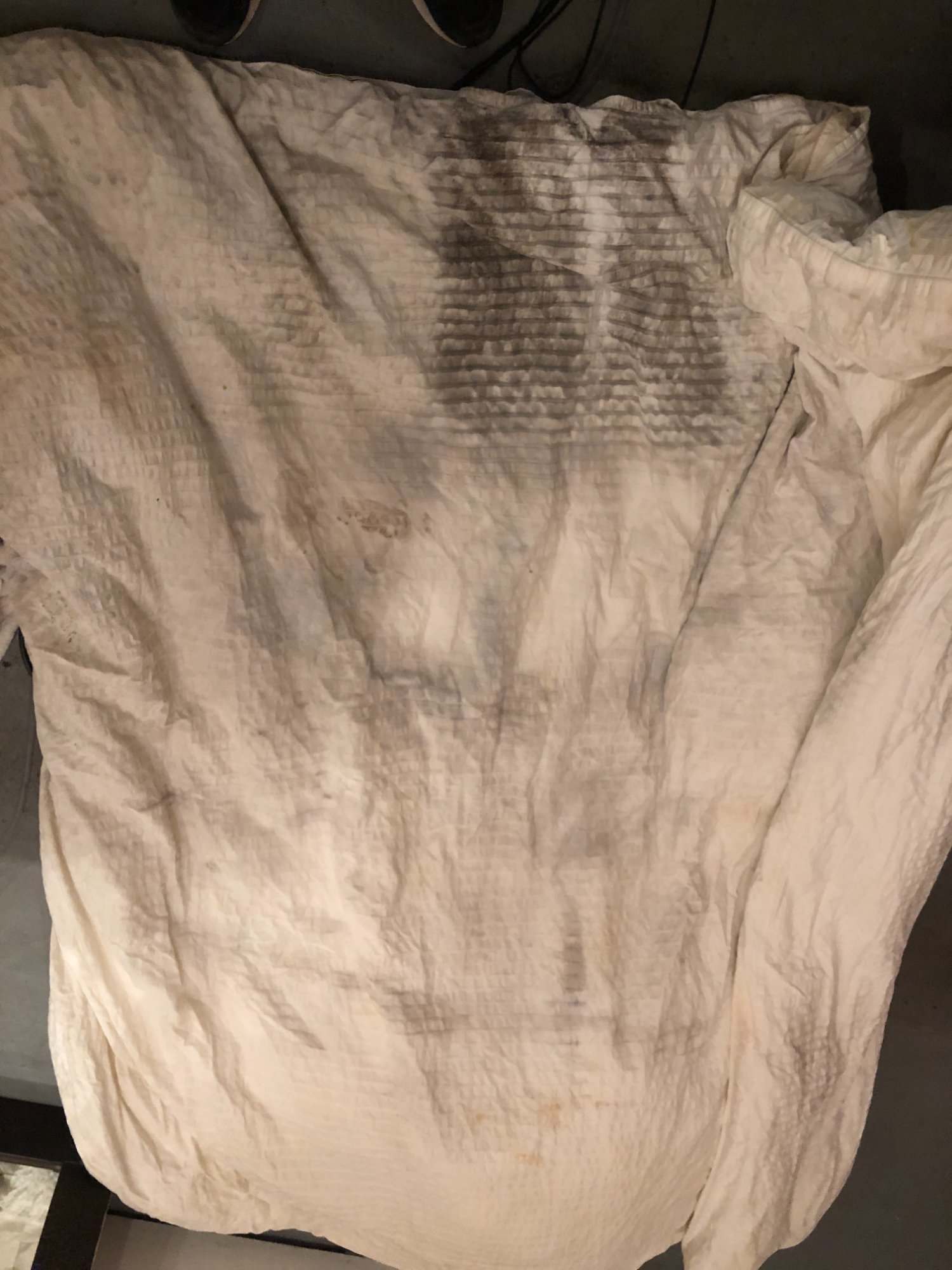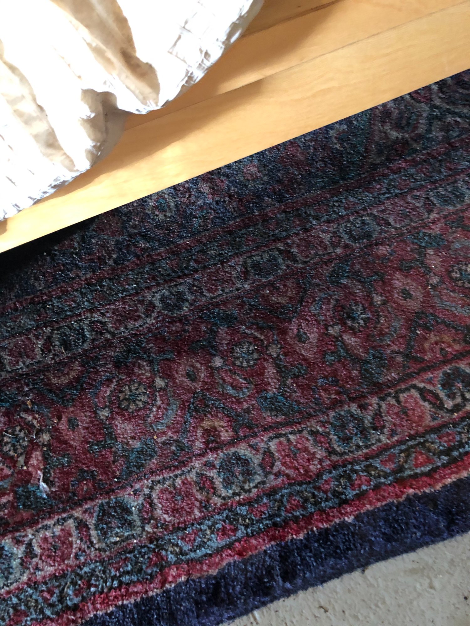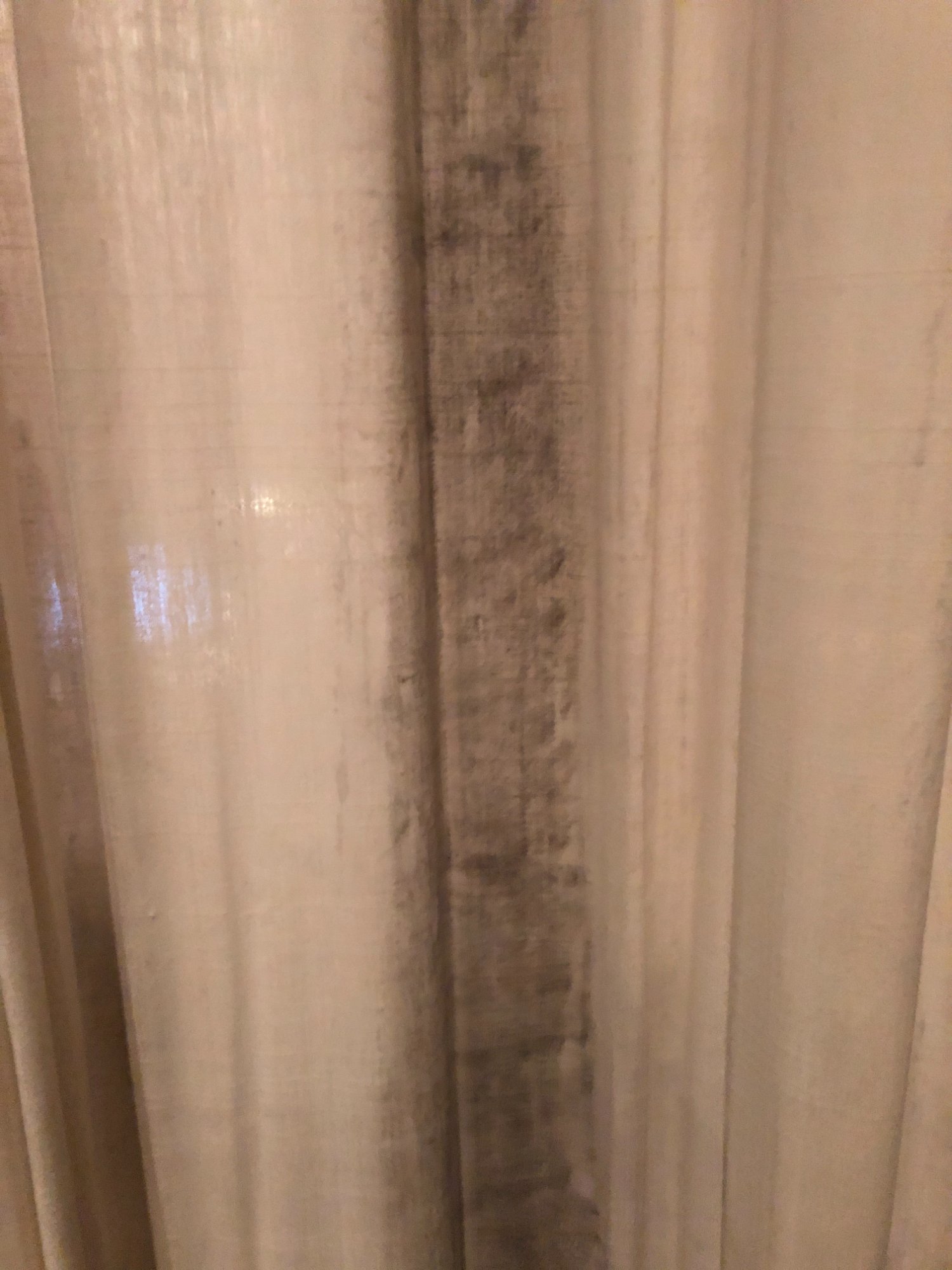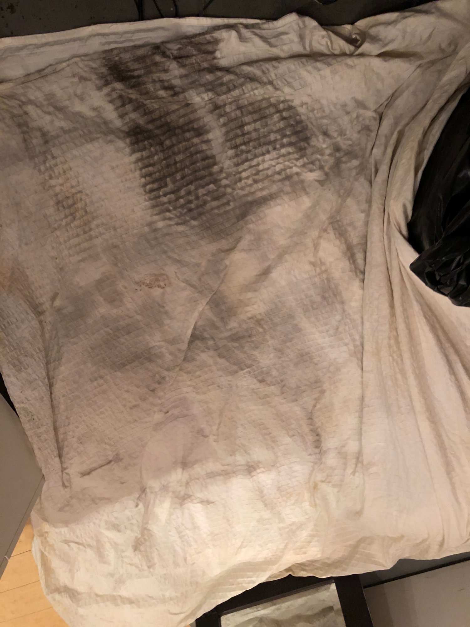 | 033 | Close-up of gray sectional sofa cushion bottom edge showing clear water tide line; dark staining visible along fabric where water reached; red rug visible below | View | FLOOD_97GreenStG21_033_Sectional_CushionEdge_WaterLine.jpeg | IMG_4203.jpeg | October 2019 (Attorney Sherman) | GOOD | HIGH |