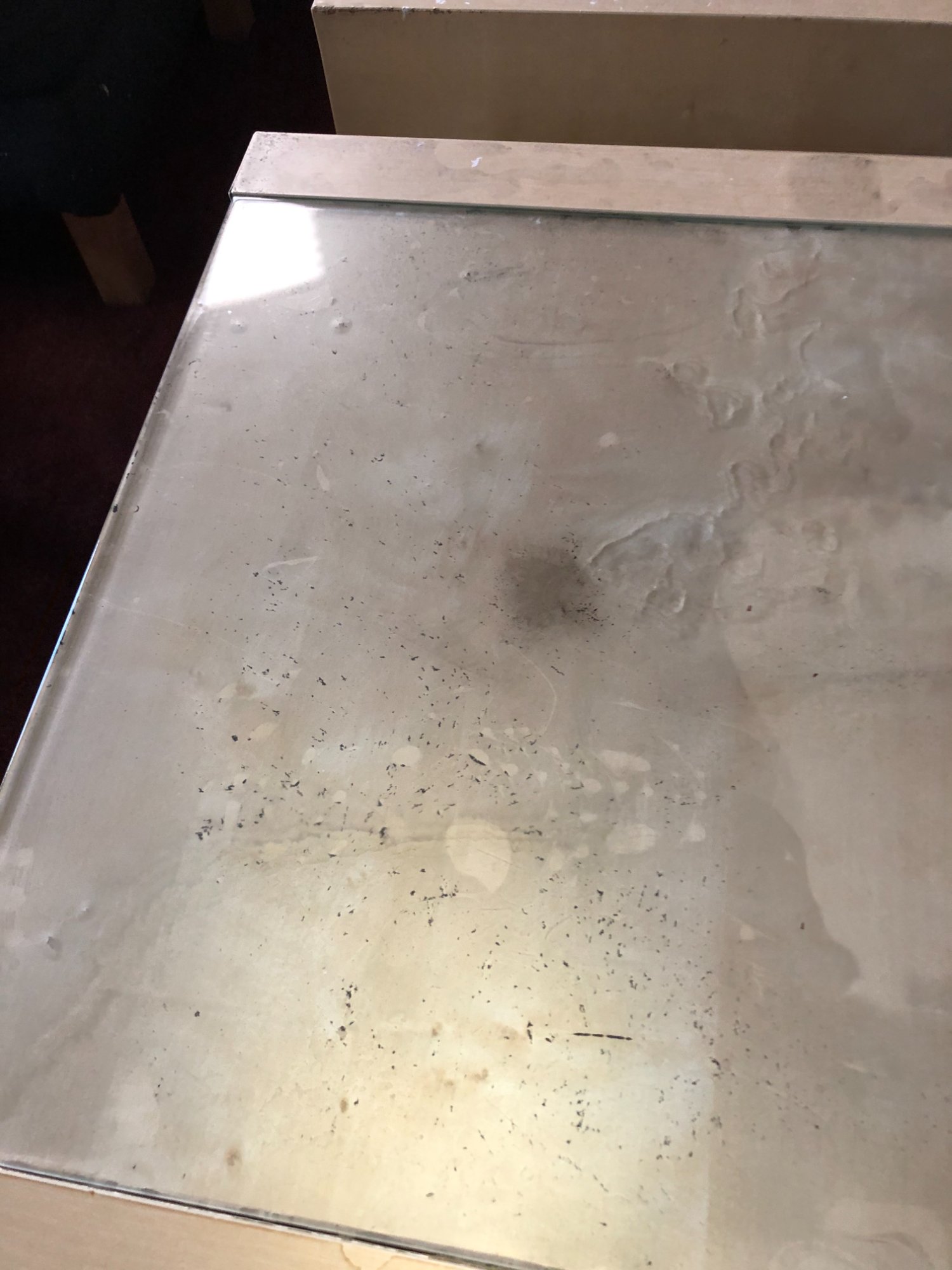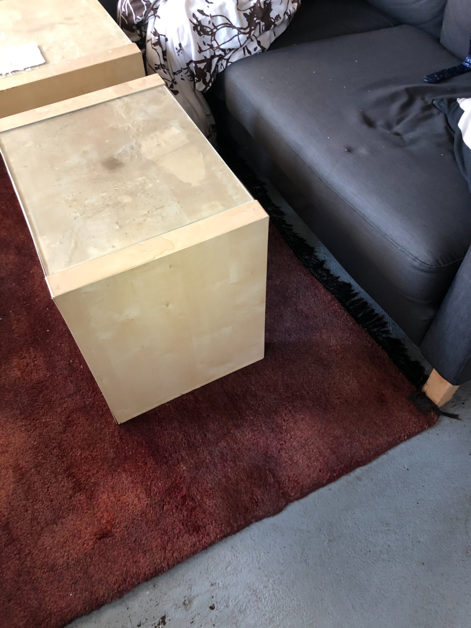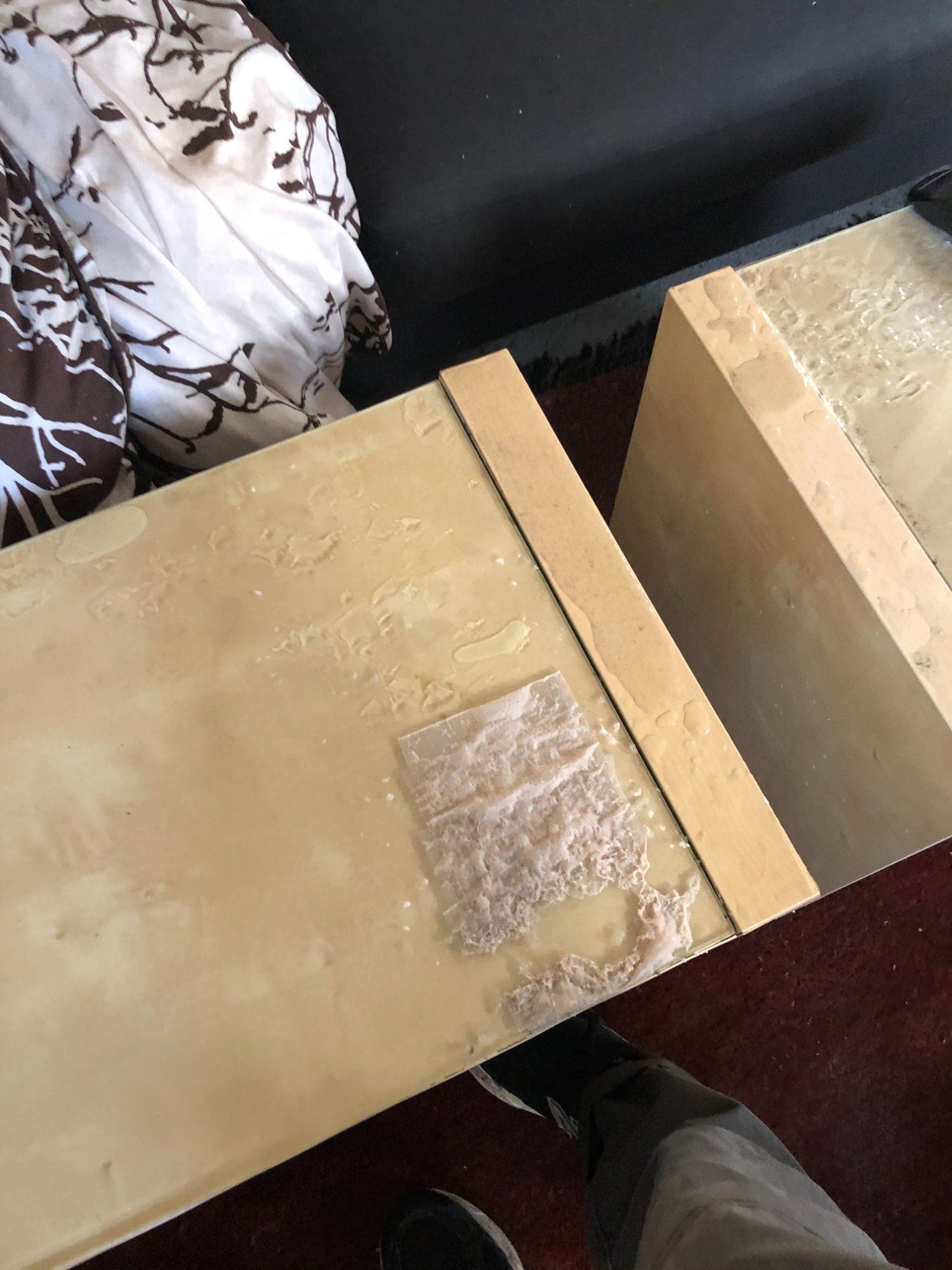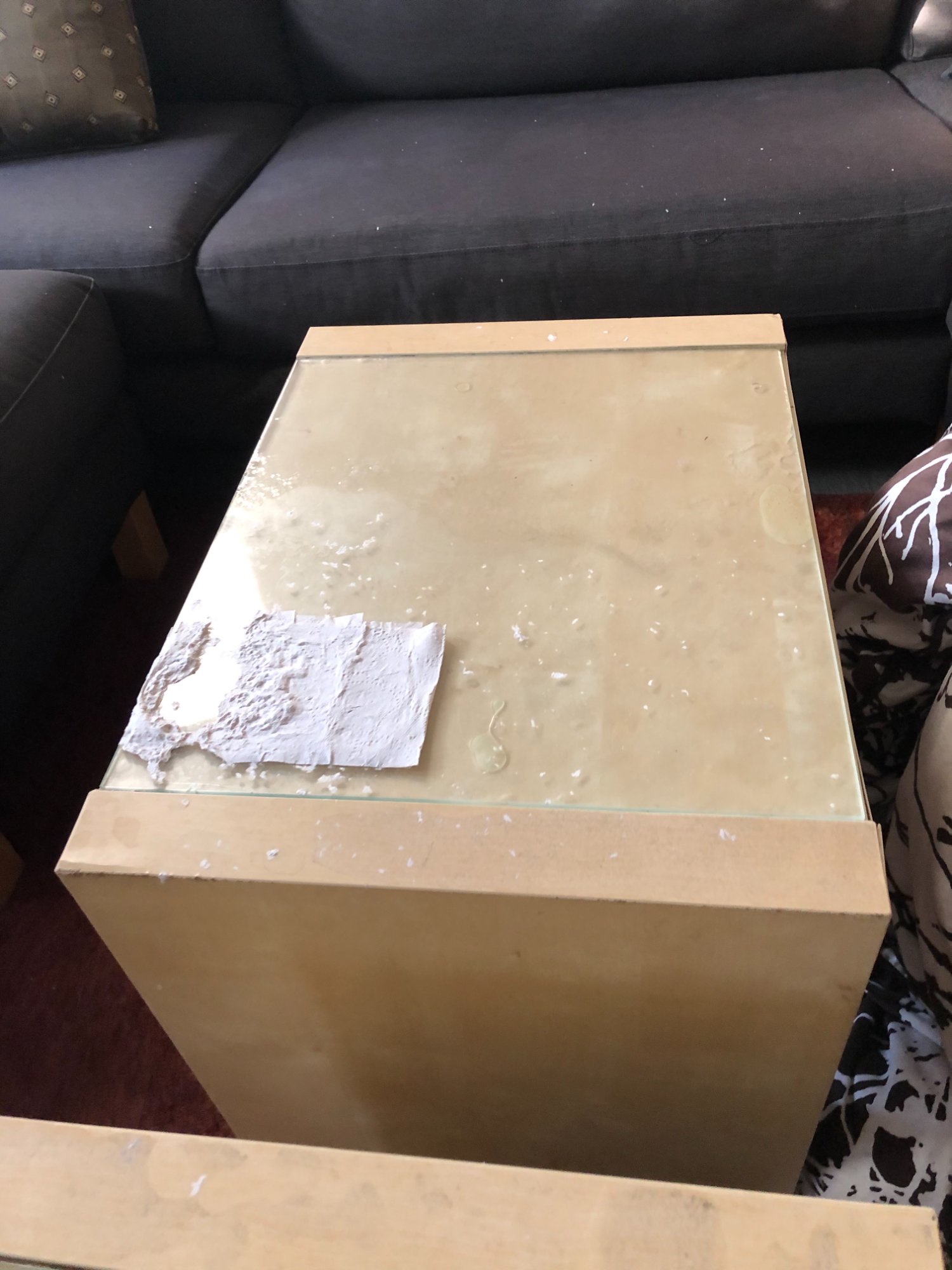 | 032 | Light wood cube end table with glass top showing severe water damage; wet paper napkin on surface; water staining and mineral deposits visible on wood; gray sectional visible in background | View | FLOOD_97GreenStG21_032_EndTable_GlassTop_WaterStaining.jpeg | IMG_4202.jpeg | October 2019 (Attorney Sherman) | GOOD | HIGH |