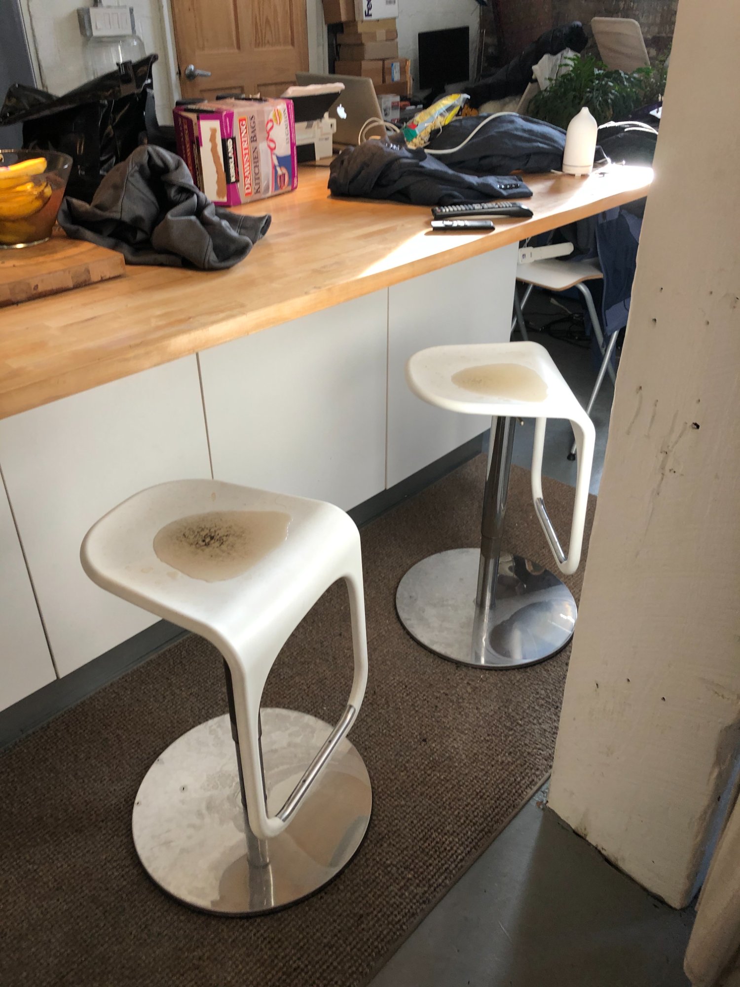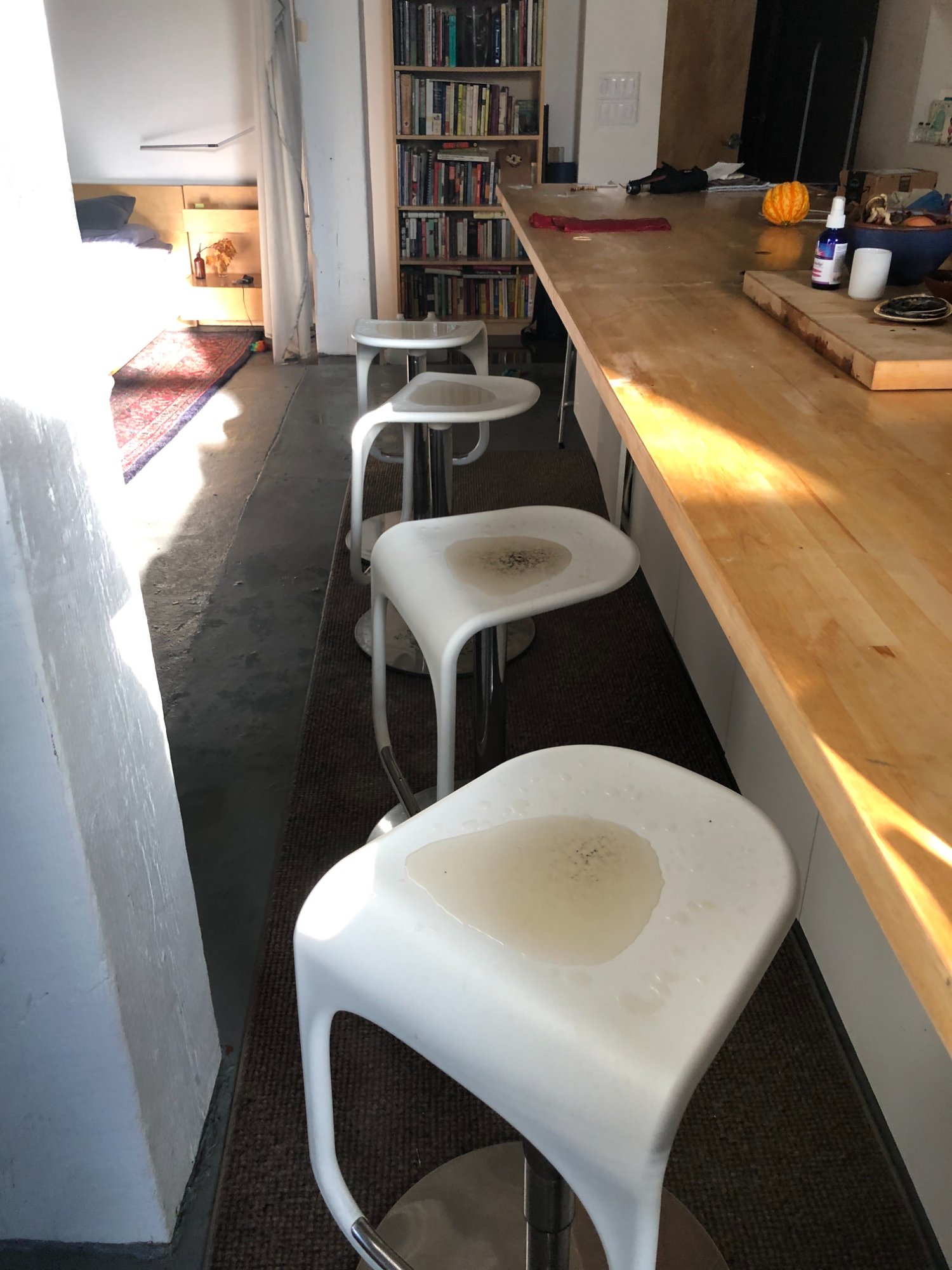| 026 | Four white bar stools at kitchen island with visible water pooling on seats; pumpkin on counter (October marker); bedroom and bookshelves in background | View | FLOOD_97GreenStG21_026_KitchenIsland_BarStools_WaterPooling.jpeg | IMG_4196.jpeg | October 2019 (Attorney Sherman) | GOOD | HIGH |