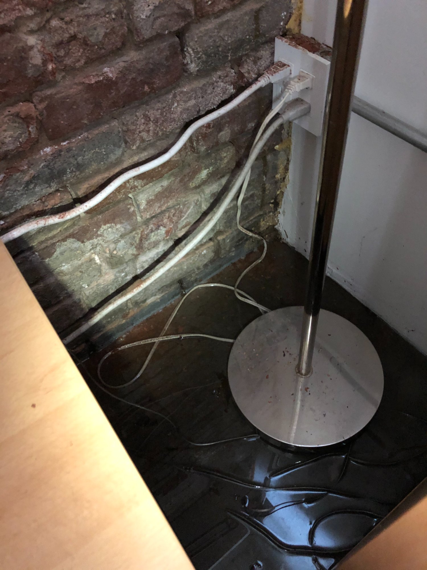 | 028 | Deep standing water at exposed brick wall; stool base and electrical cables submerged; safety hazard documentation | View | FLOOD_97GreenStG21_028_ExposedBrick_DeepWater_CablesSubmerged.jpeg | IMG_4198.jpeg | October 2019 (Attorney Sherman) | GOOD | HIGH |