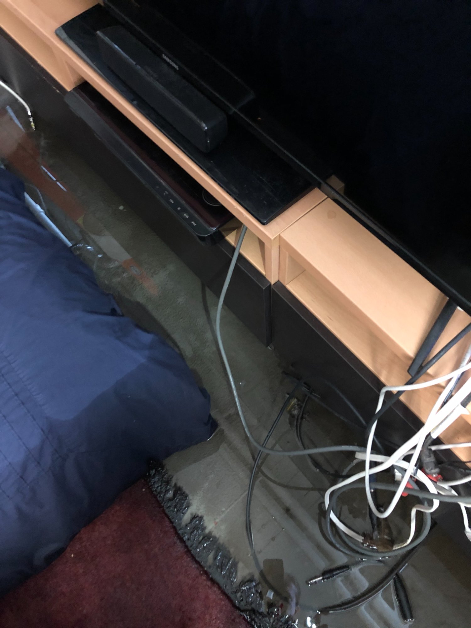 | 029 | TV console/entertainment center with cables and wires in standing water; wet carpet edge visible; electronics at risk | View | FLOOD_97GreenStG21_029_TVConsole_CablesInWater_RugEdge.jpeg | IMG_4199.jpeg | October 2019 (Attorney Sherman) | GOOD | HIGH |