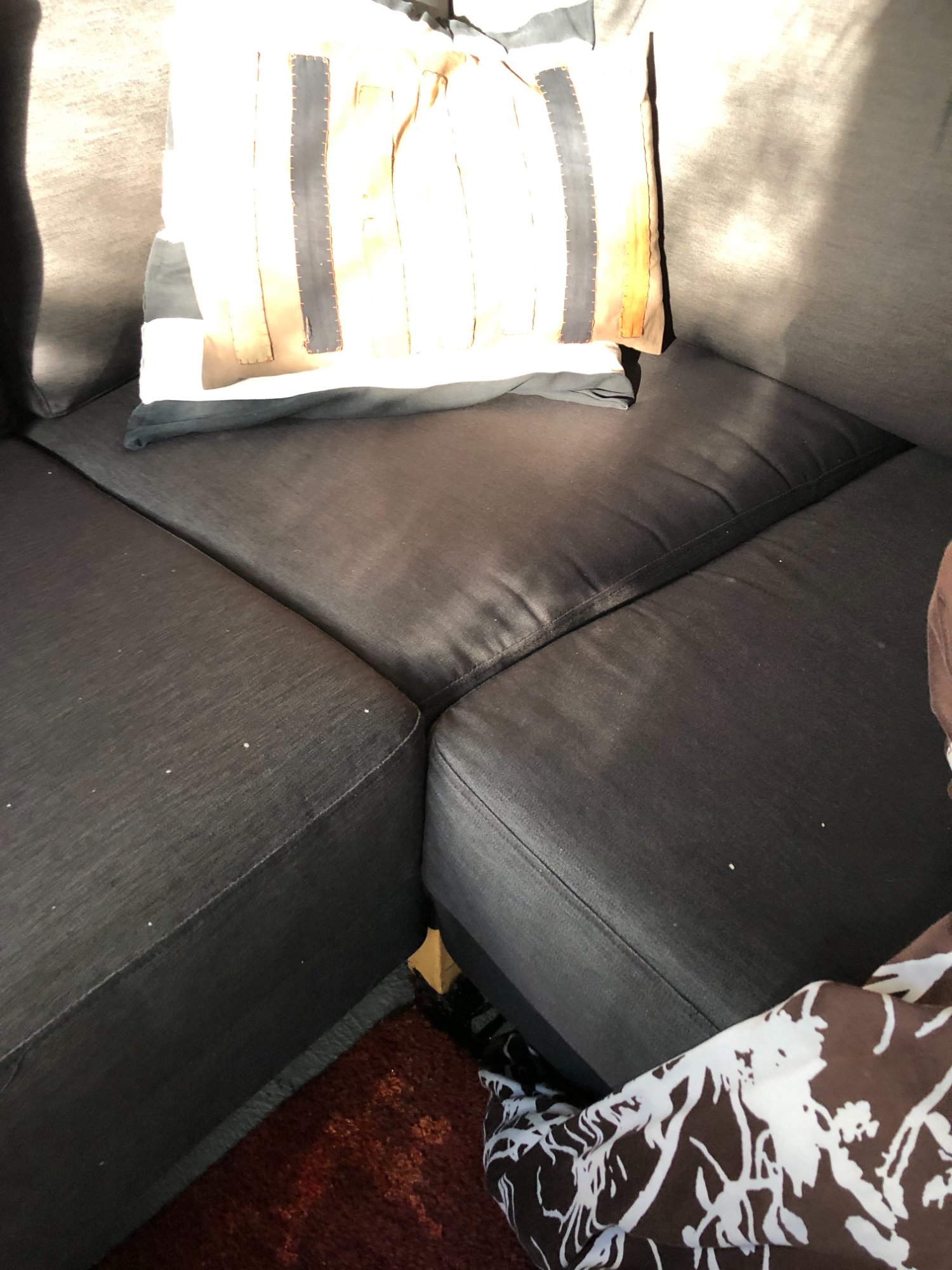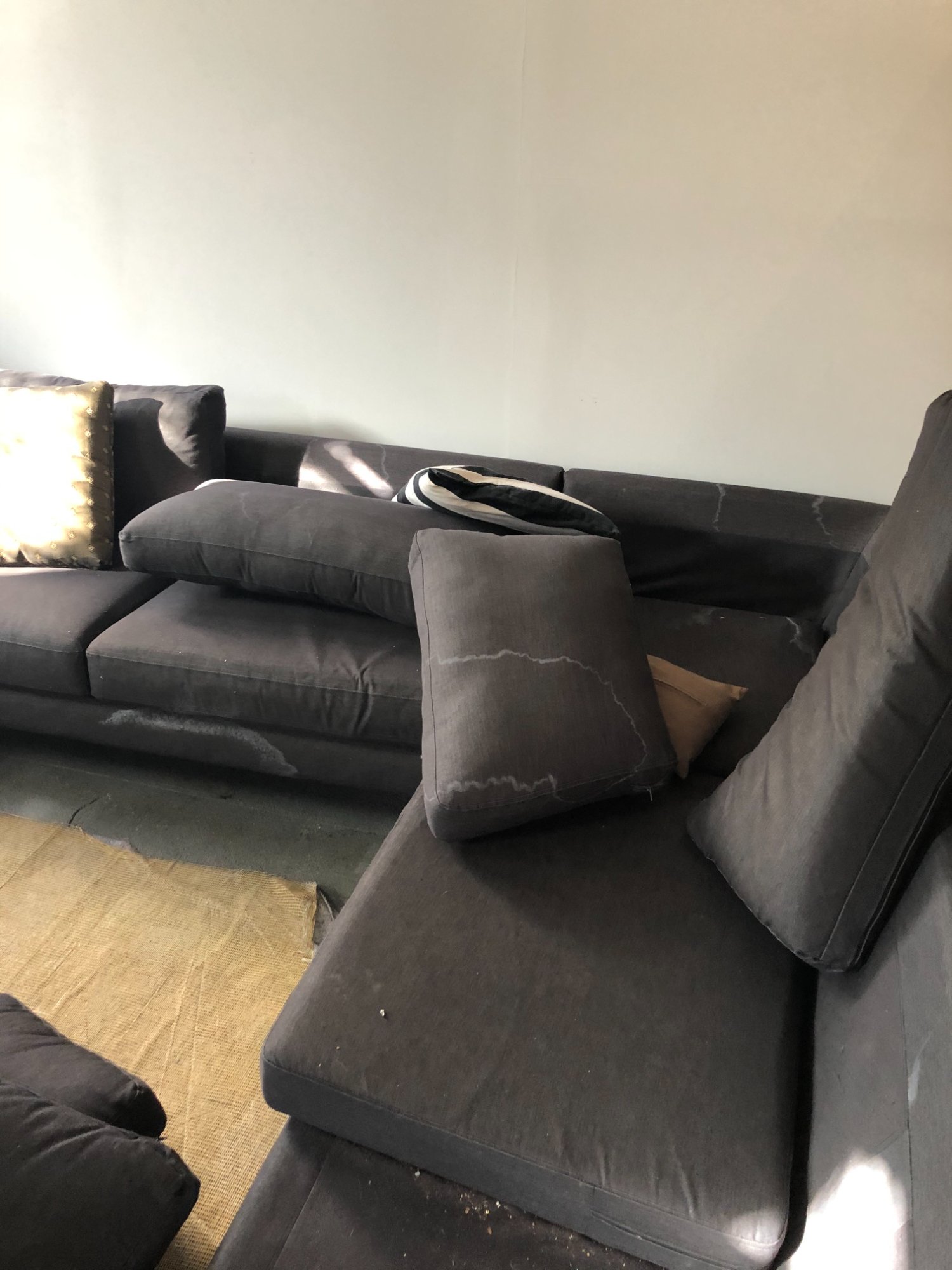 | 034 | Gray sectional corner section with striped decorative pillow; shows furniture context; minimal visible damage in this shot; debris particles visible on cushions | View | FLOOD_97GreenStG21_034_Sectional_CornerSection_Pillows.jpeg | IMG_4204.jpeg | October 2019 (Attorney Sherman) | GOOD | LOW |