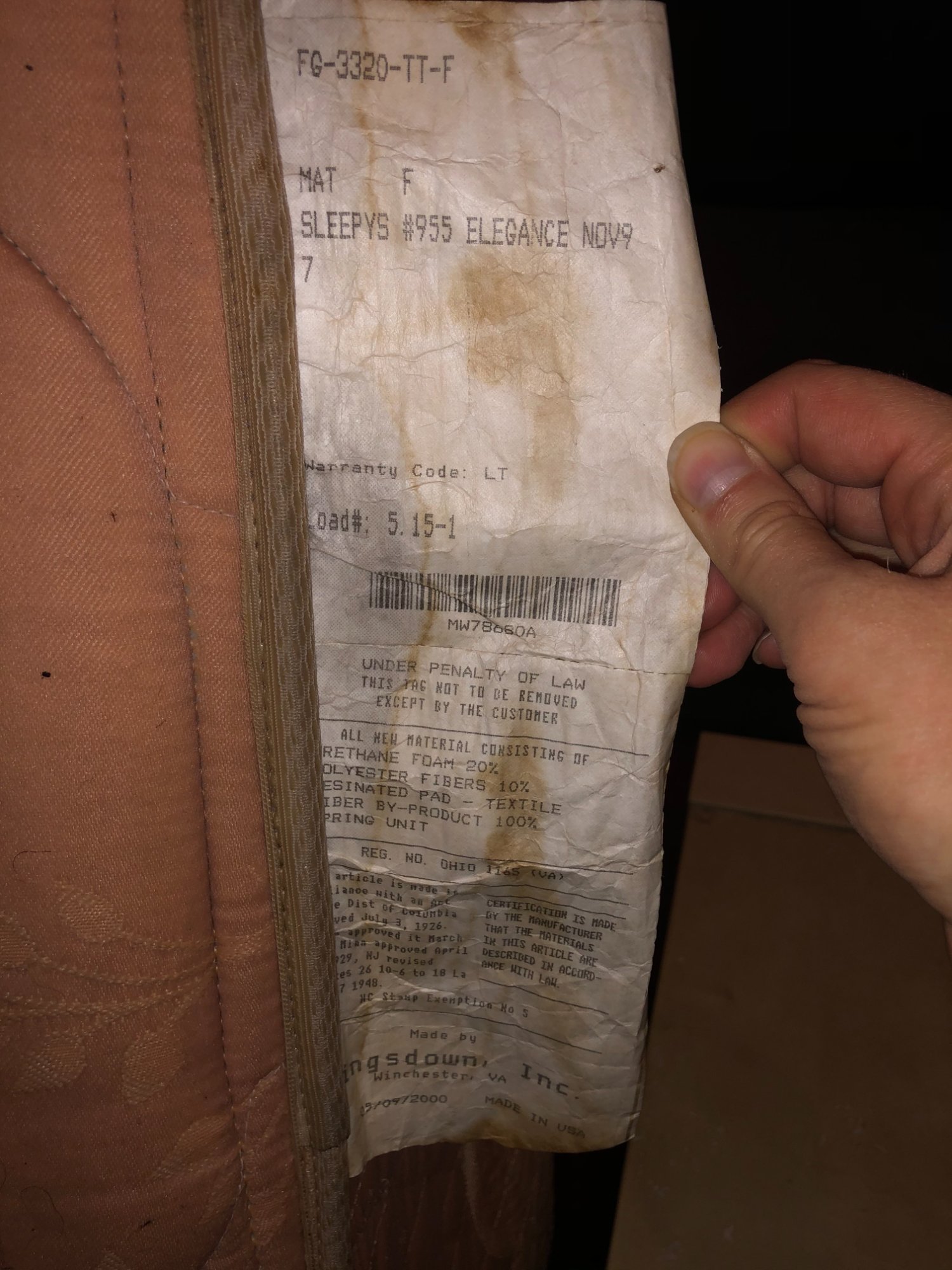 | 108–109 | Sleepy's / Kingsdown Inc. | Mattress (date code ~2000) | Tab 101 — Property Damage |