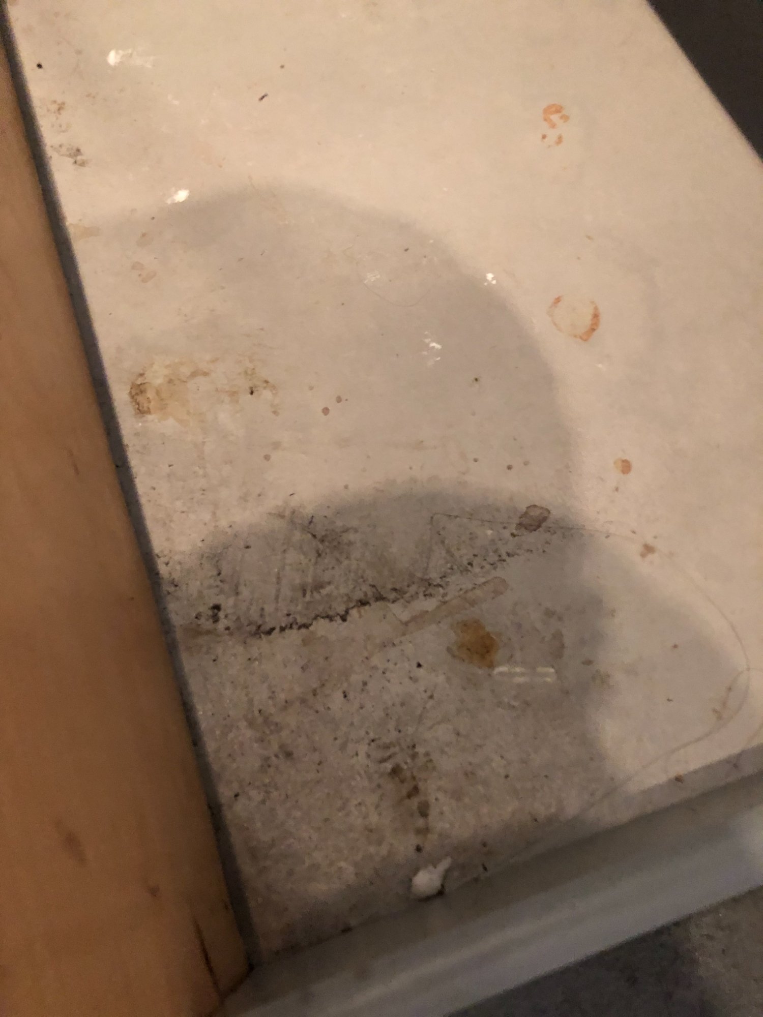 | 031 | Close-up of coffee table surface showing detailed water damage patterns, mineral deposits, debris, and staining | View | FLOOD_97GreenStG21_031_CoffeeTable_DetailShot_MineralDeposits.jpeg | IMG_4201.jpeg | October 2019 (Attorney Sherman) | GOOD | HIGH |