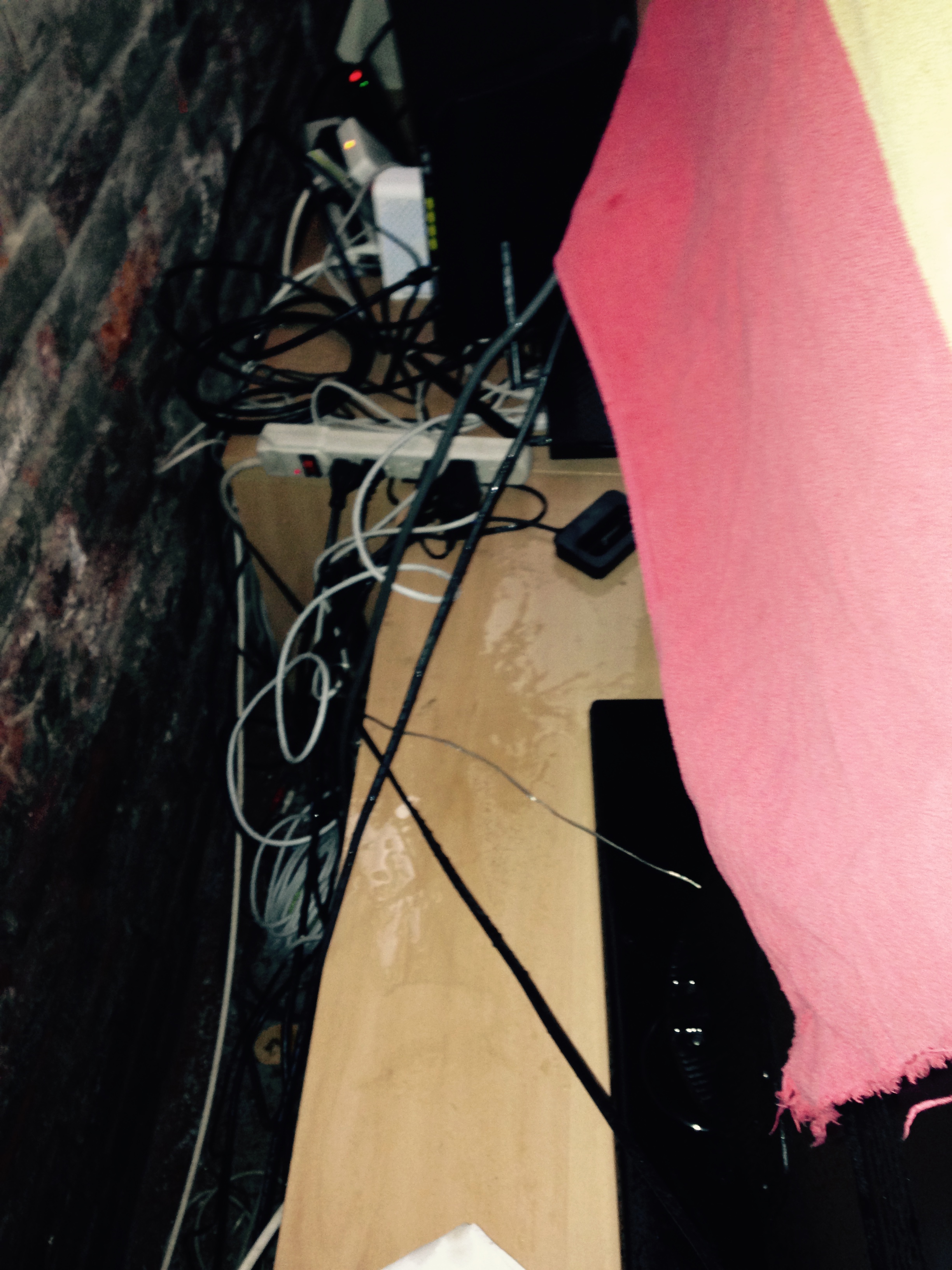 | P-11 | Desk/workstation with electronic equipment (power strips, router); water staining on wood surface; pink fabric protecting equipment | View | WT-116_2015-11-16_Photo_01_IMG_4021.jpeg | IMG_4021.JPG | 2015-11-16 12:55:45 |