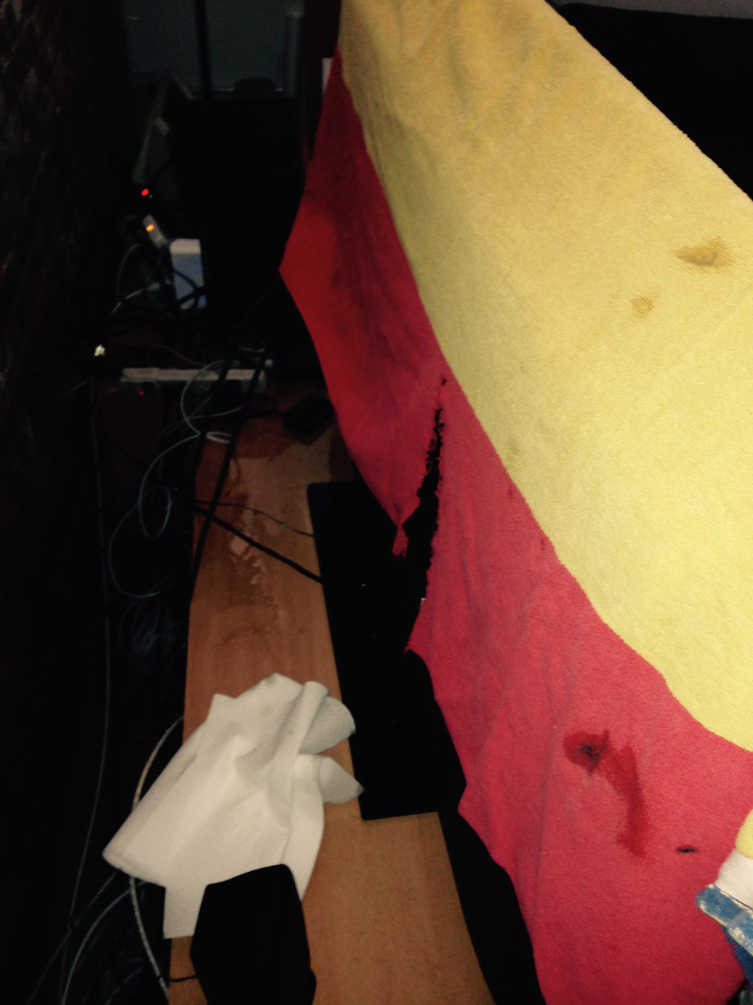 | P-12 | Yellow/red blankets covering equipment as protection; water staining visible on fabric; paper towels for absorption | View | WT-116_2015-11-16_Photo_02_IMG_4022.jpeg | IMG_4022.JPG | 2015-11-16 12:55:54 |
