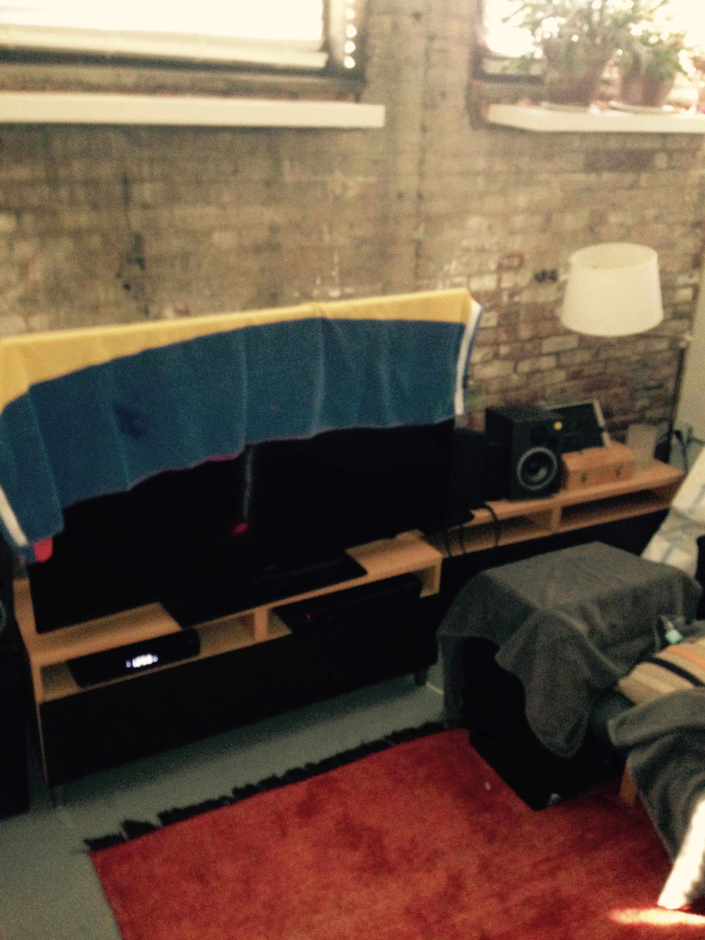 | P-13 | TV/entertainment center covered with blankets (blue/yellow) for protection; audio equipment; exposed brick wall | View | WT-116_2015-11-16_Photo_03_IMG_4023.jpeg | IMG_4023.JPG | 2015-11-16 12:56:09 |